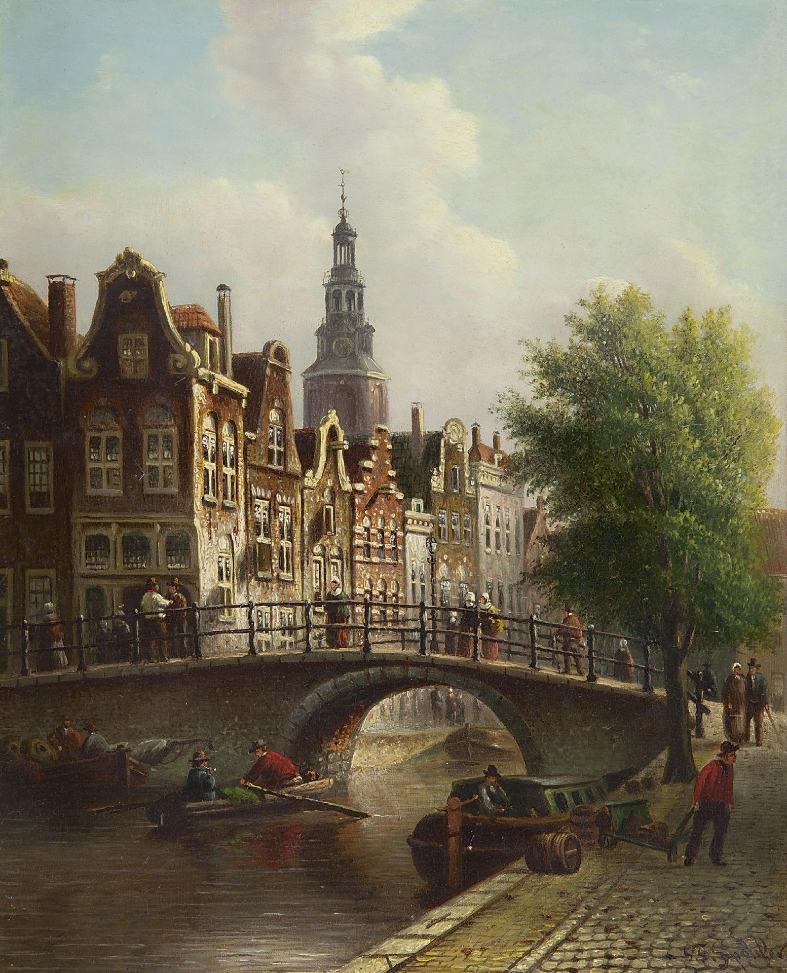 Johannes Franciscus Spohler kunstwerk • schilderij • voorheen te koop Stadsgezicht met de Amsterdamse Montelbaanstoren