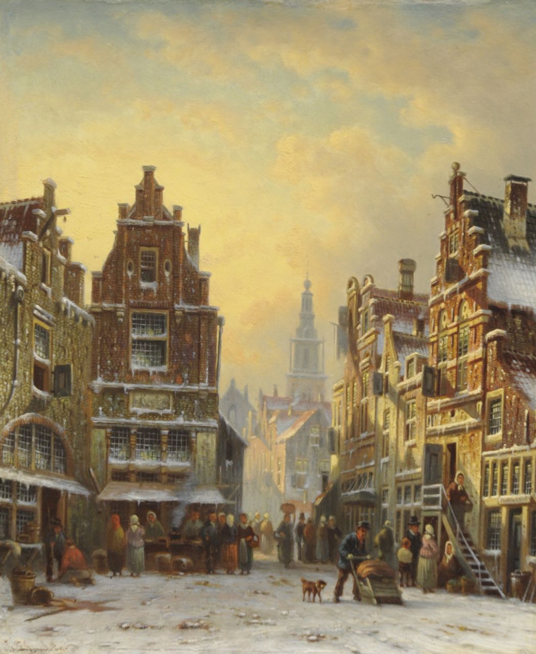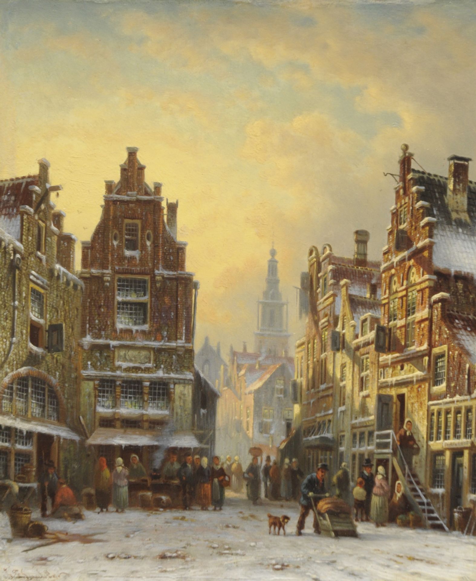 Johannes Franciscus Spohler kunstwerk • schilderij • voorheen te koop Winters stadsgezicht met de Amsterdamse Zuiderkerkstoren