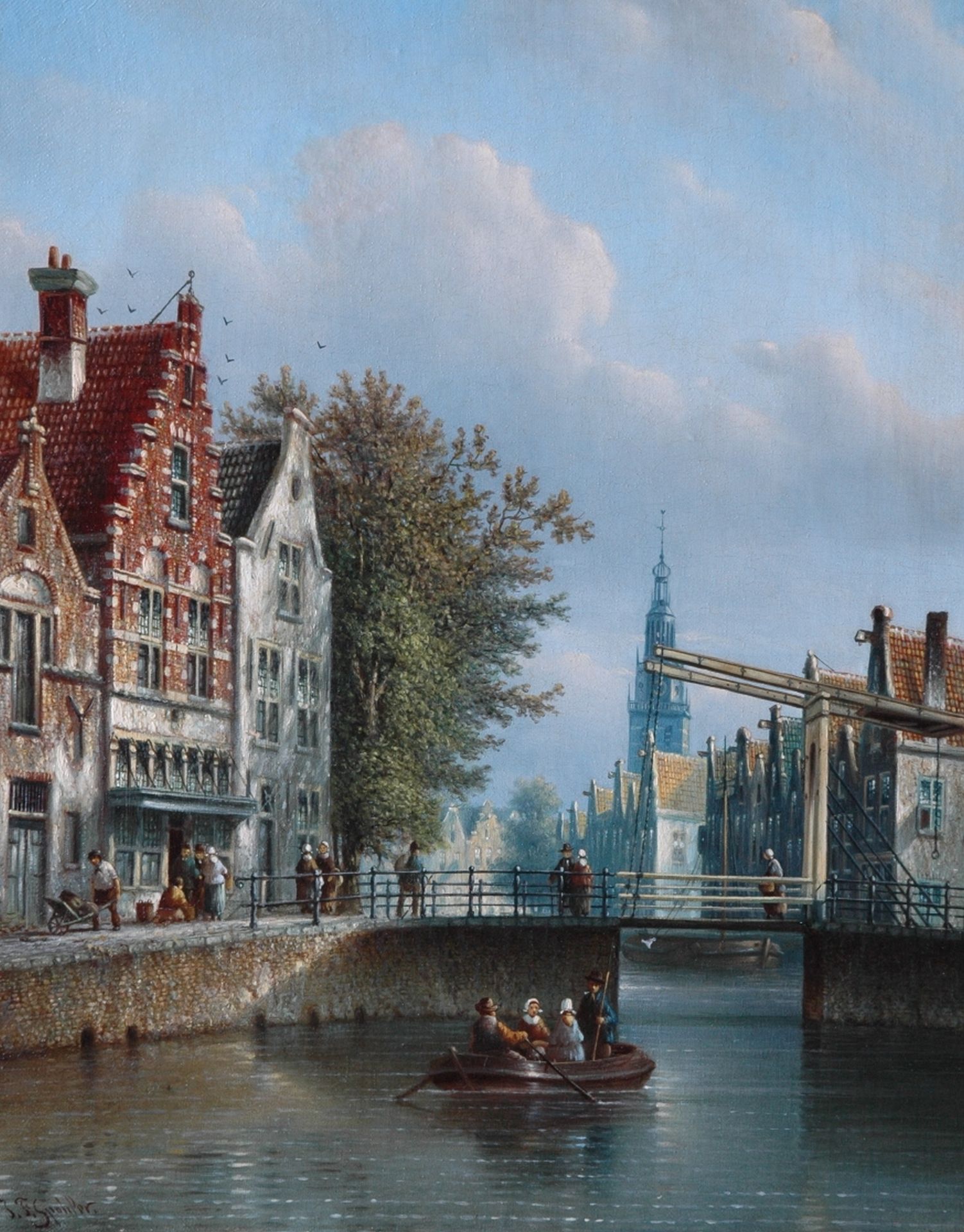 Johannes Franciscus Spohler kunstwerk • schilderij • voorheen te koop Zomers grachtje met roeiboot bij een ophaalbrug