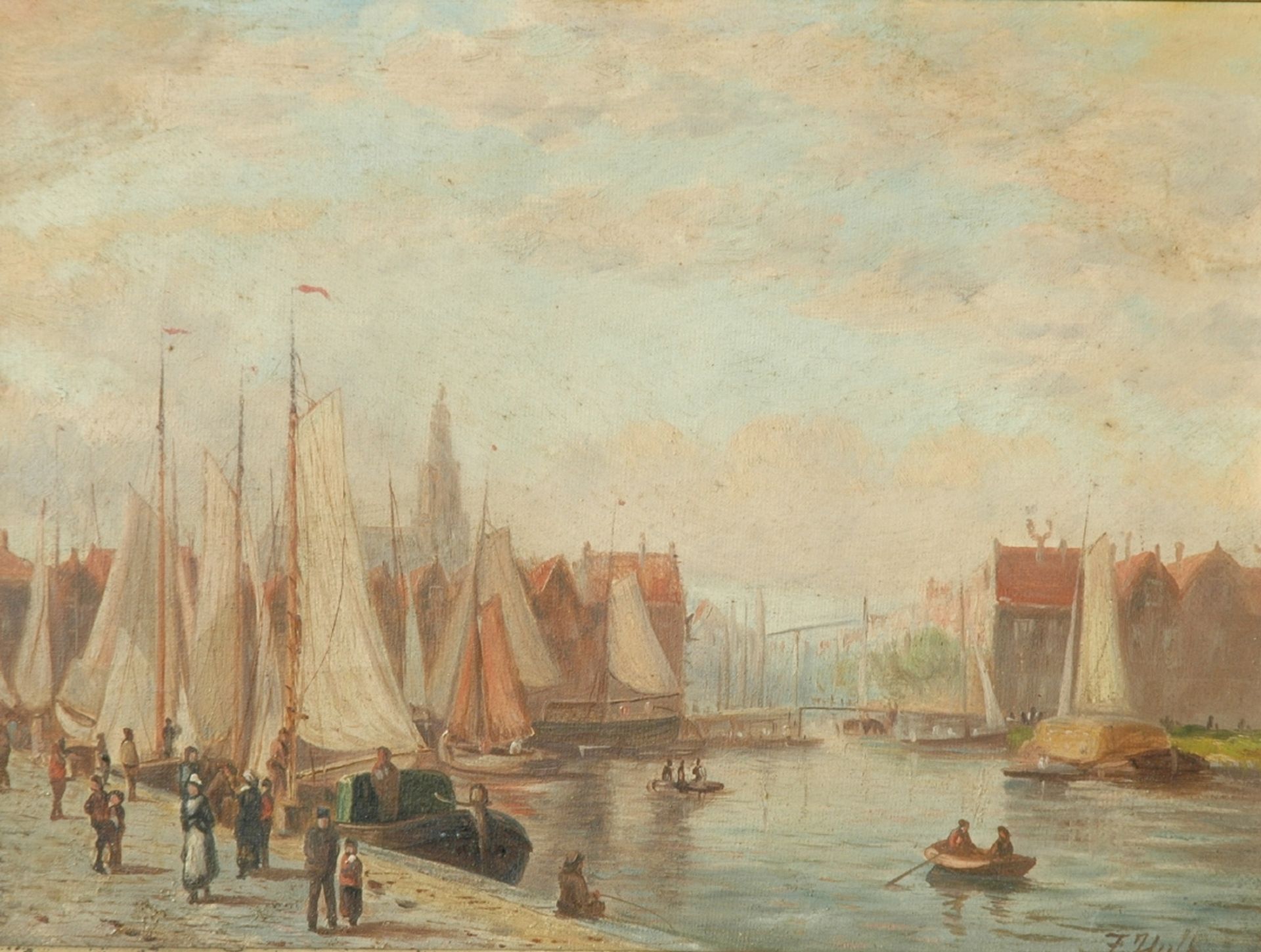 Johannes Frederik Hulk kunstwerk • schilderij • voorheen te koop Afgemeerde zeilschepen aan een kade