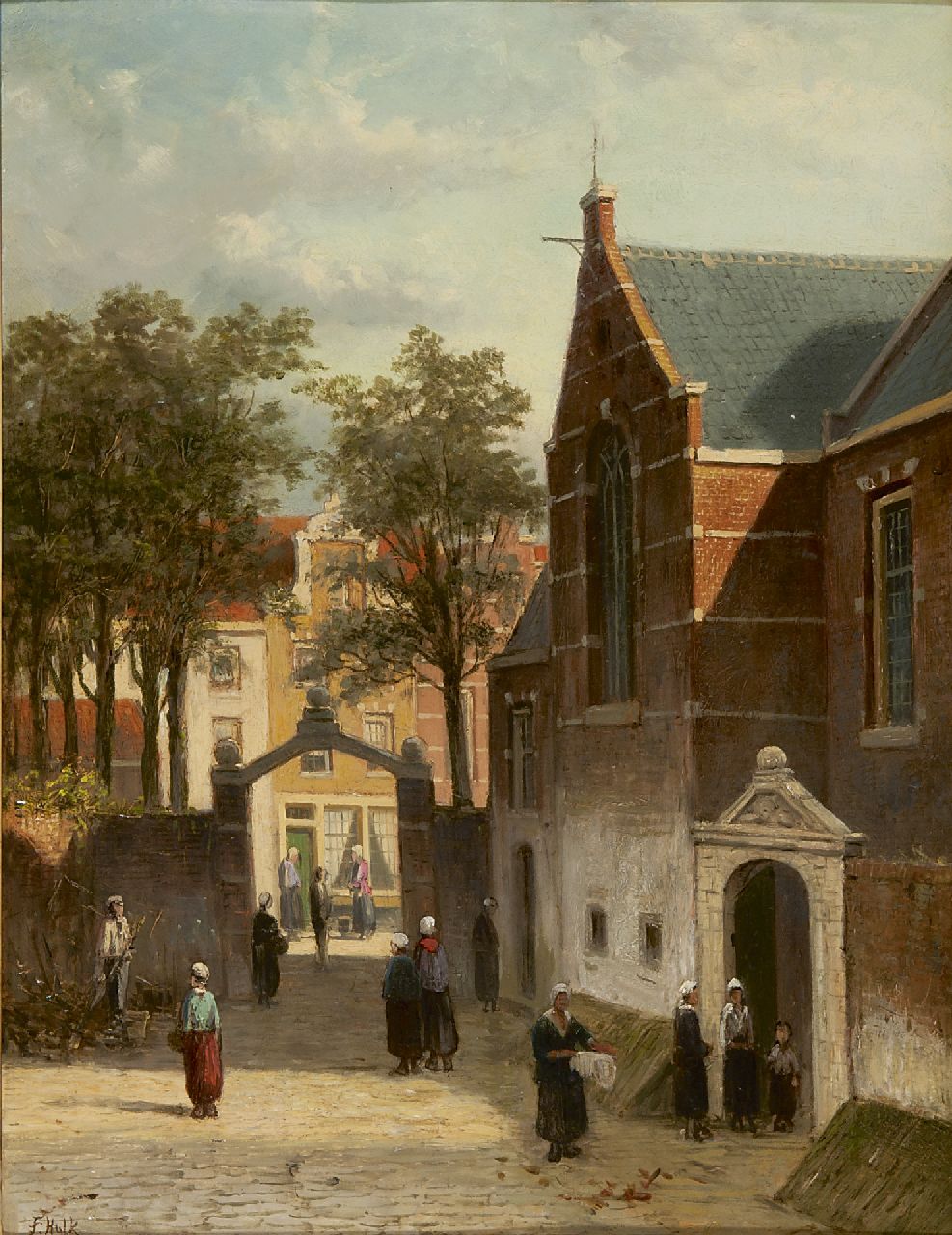 Johannes Frederik Hulk kunstwerk • schilderij • voorheen te koop Bedrijvigheid op een Hollands kerkplein