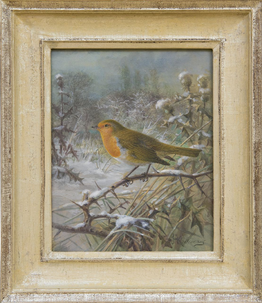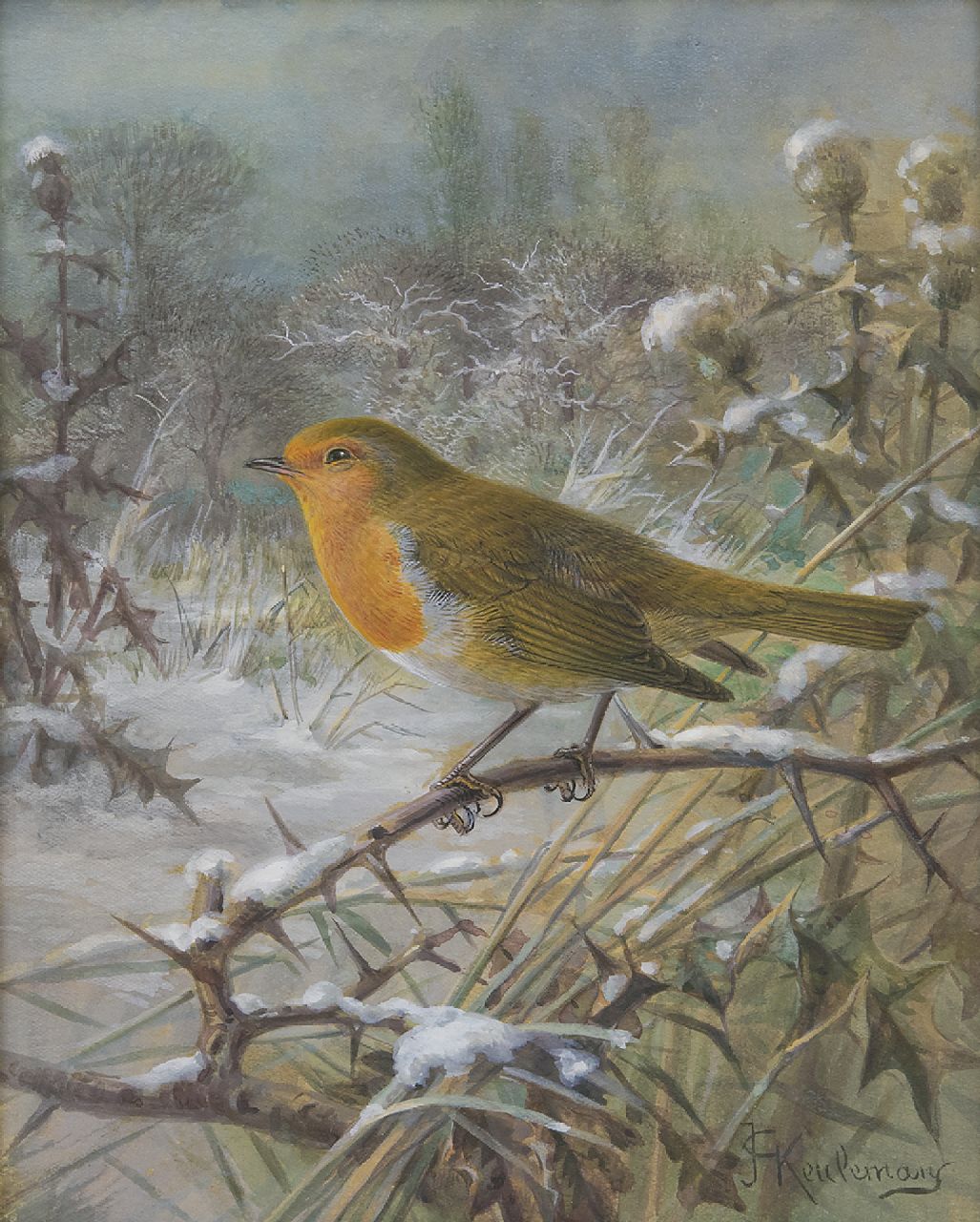 Johannes Gerardus Keulemans kunstwerk • aquarel • tekening • voorheen te koop Roodborstje in sneeuwlandschap