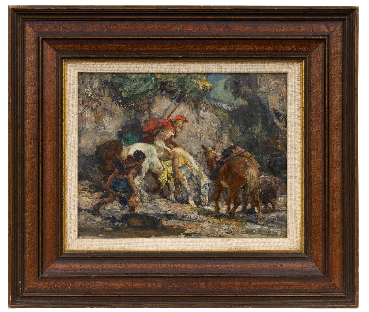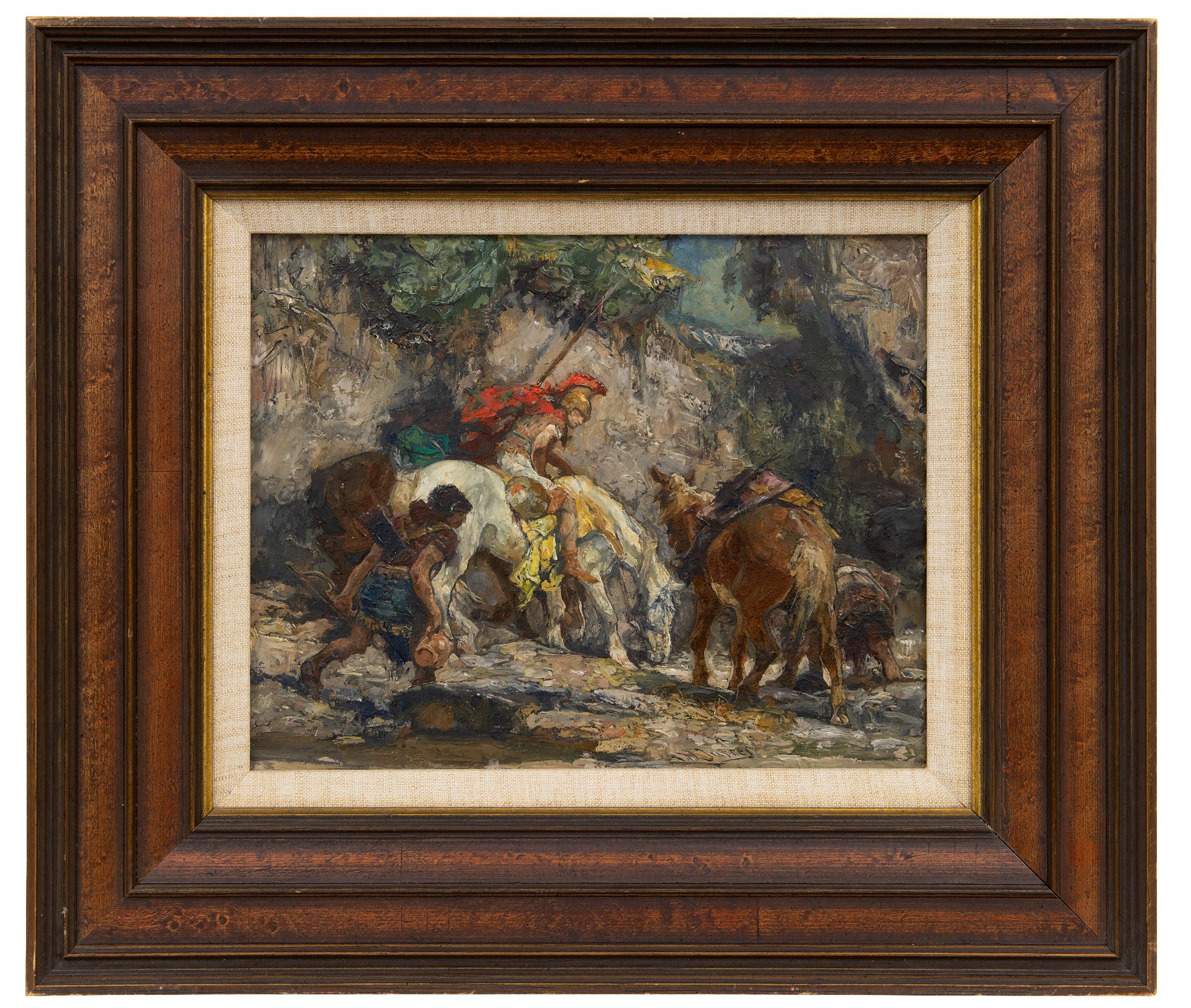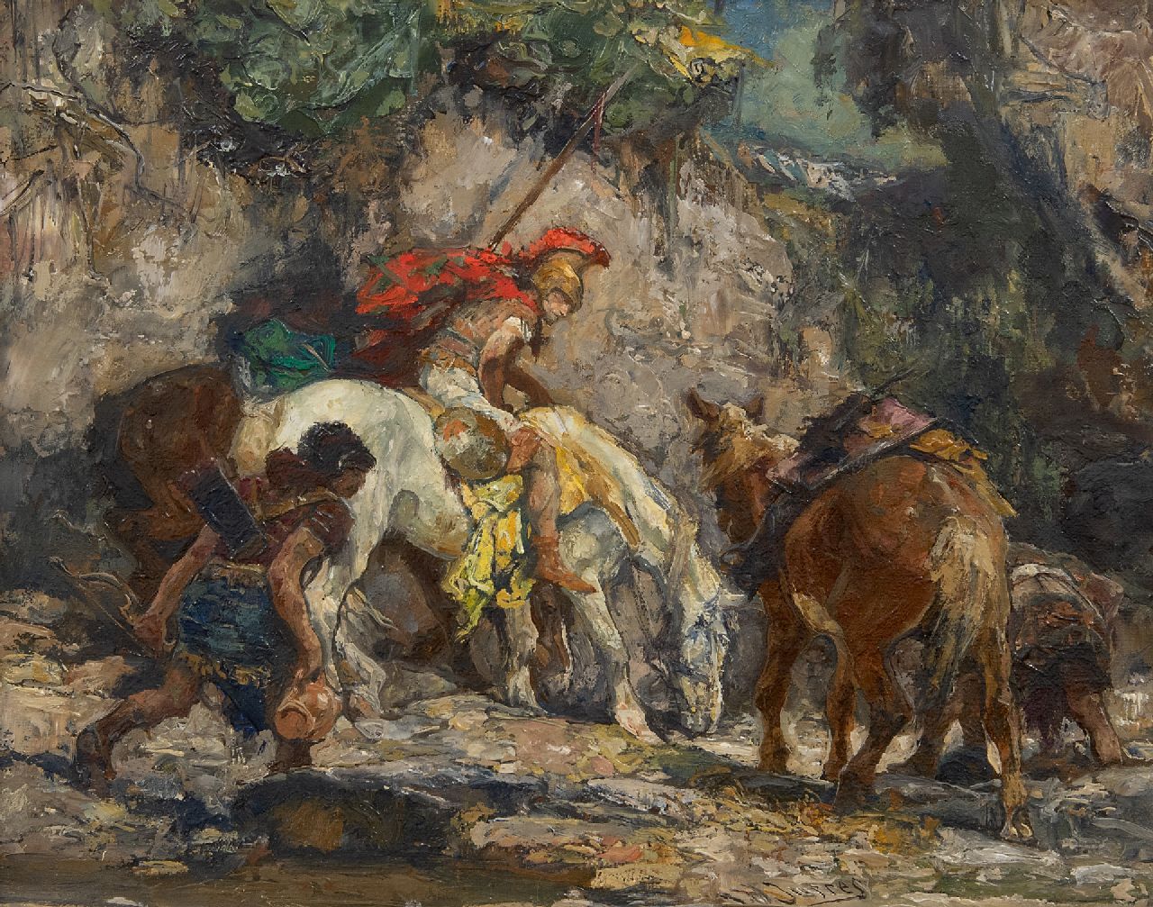 Johannes Hendricus Jurres kunstwerk • schilderij • voorheen te koop Krijgslieden met drinkende paarden