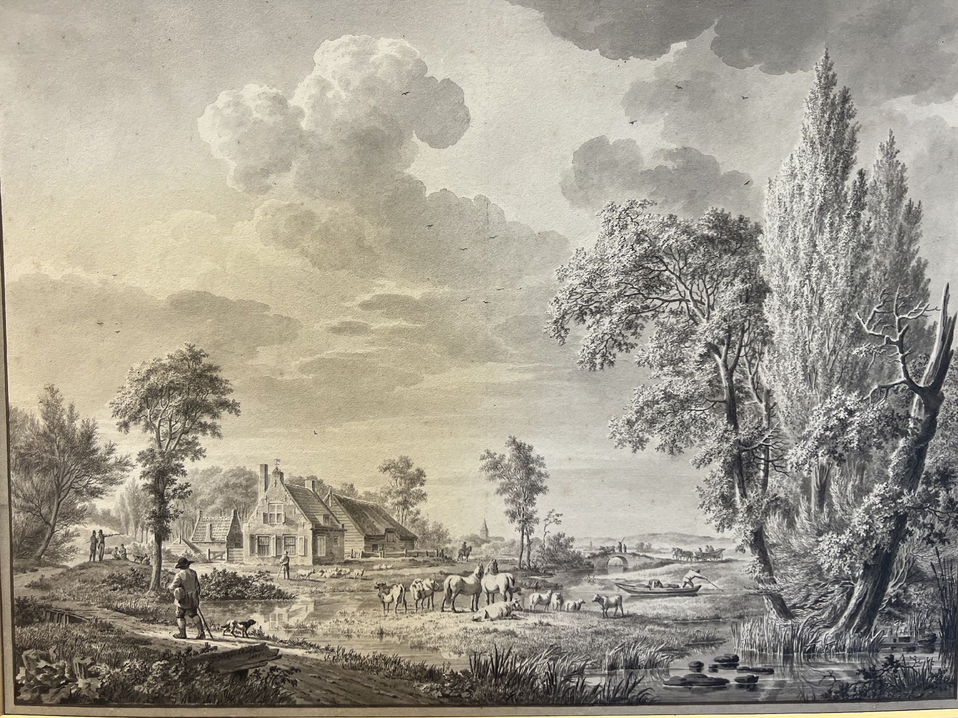 Johannes Hermanus Koekkoek kunstwerk • aquarel • tekening • te koop Rivierlandschap met figuren en vee bij een boerenhoeve