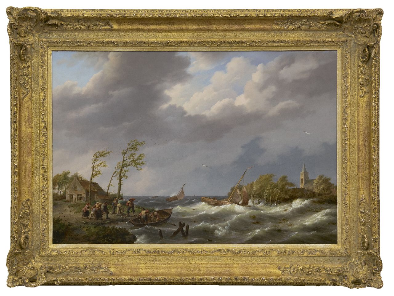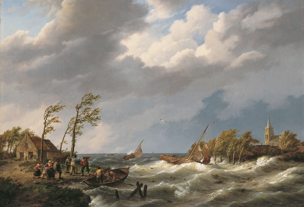 Stormachtig zwerk, woelende waters, buigende bomen, onheilspellend fel licht en vissers in nood: dramatischer kon Johannes Hermanus Koekkoek, de stamvader van het beroemde schildersgeslacht, de strijd van de mens tegen de woedende kracht der elementen niet verbeelden. Een boot levert een gevecht met de wind en het water om veilig de thuishaven te bereiken, vanaf de wal gadegeslagen door angstige dorpelingen, vanuit de lucht door schijnbaar onbekommerd op de wind zeilende meeuwen. In een uitvarende sloep lijkt hulp onderweg. Op het schilderij rechtsboven hebben schipbreukelingen op een rots het vege lijf kunnen redden en richten zich in hun wanhoop tot elkaar en hun Schepper. Slachtoffer van de nietsontziende storm, zien zij de laatste wrakstukken van hun dierbare schip ten ondergaan in de onstuimige zee. Koekkoek knoopt met deze twee groots en meeslepend geschilderde taferelen aan bij de dramatische zeestukken uit de Gouden Eeuw en bij de eigentijdse, internationale Romantiek, waarin de nietigheid van de mens ten opzichte van het natuurgeweld centraal staat. Zijn mengeling van romantiek, allure en vakmanschap maakte hem al bij leven tot een vermaard marineschilder in binnen- en buitenland.