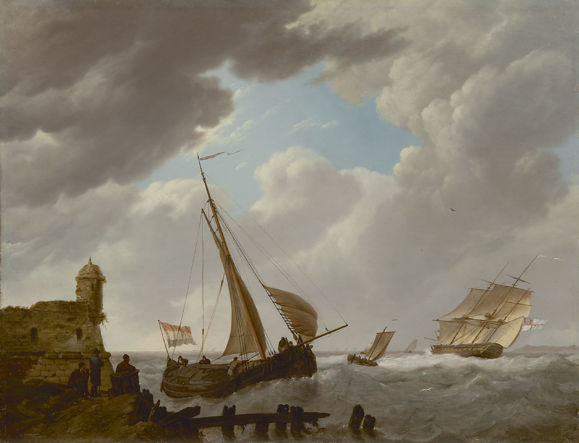 Johannes Hermanus Koekkoek kunstwerk • schilderij • voorheen te koop Tjalk en Engels oorlogsschip in de Zeeuwse wateren