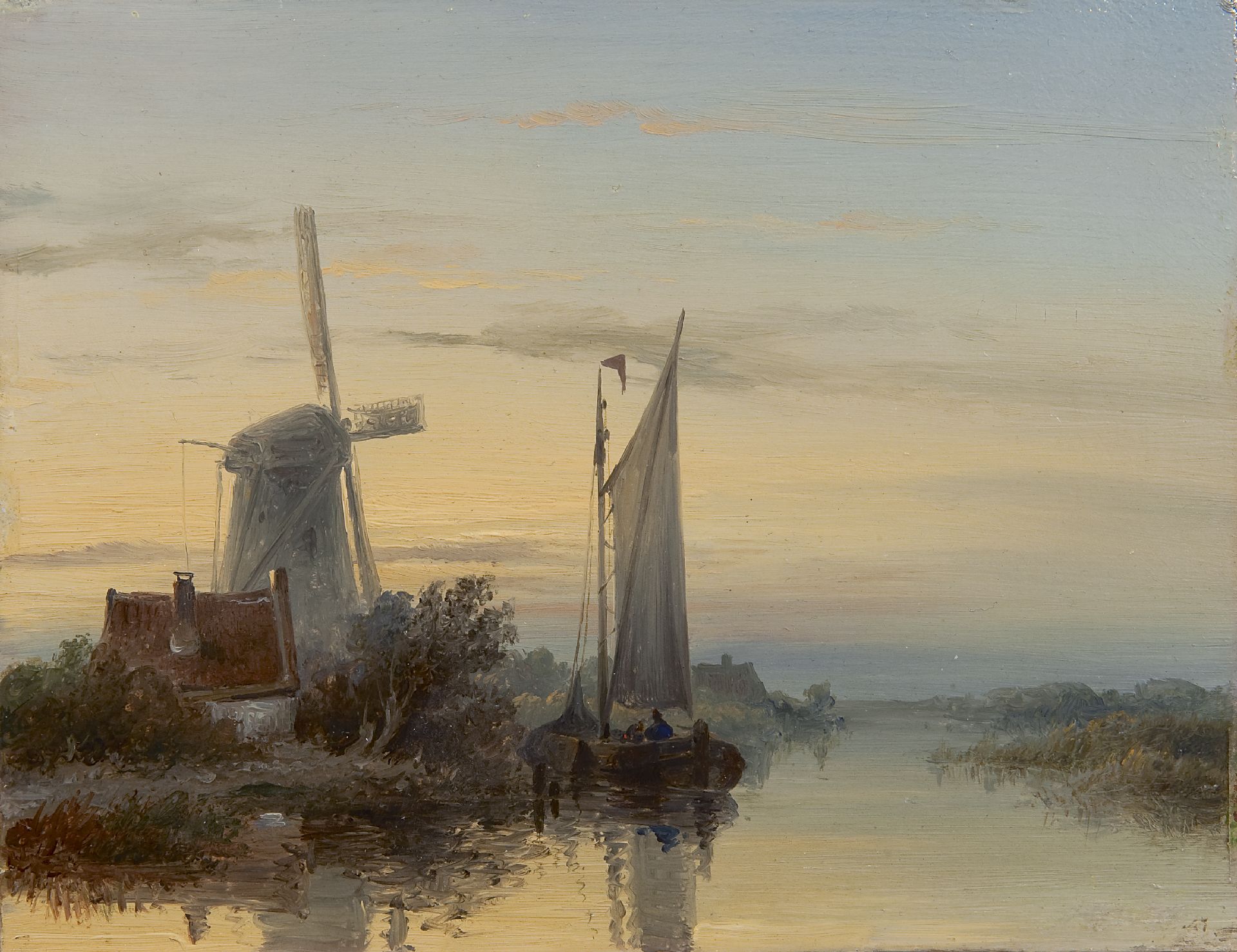 Johannes Hilverdink kunstwerk • schilderij • voorheen te koop Afgemeerde platbodem bij een molen