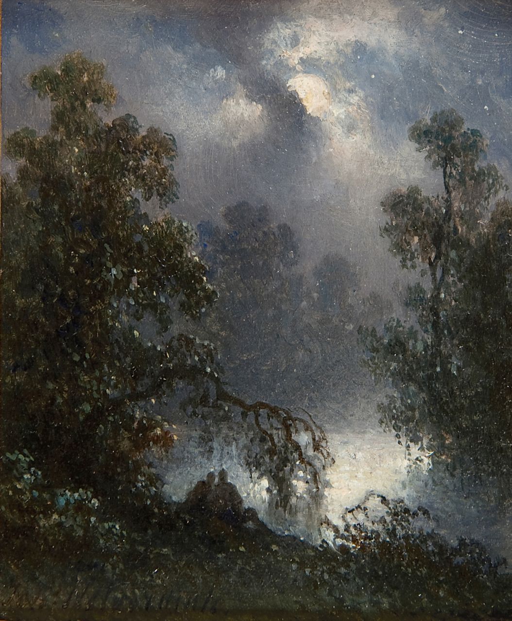 Johannes Hilverdink kunstwerk • schilderij • voorheen te koop Bosvijver met paar bij maanlicht