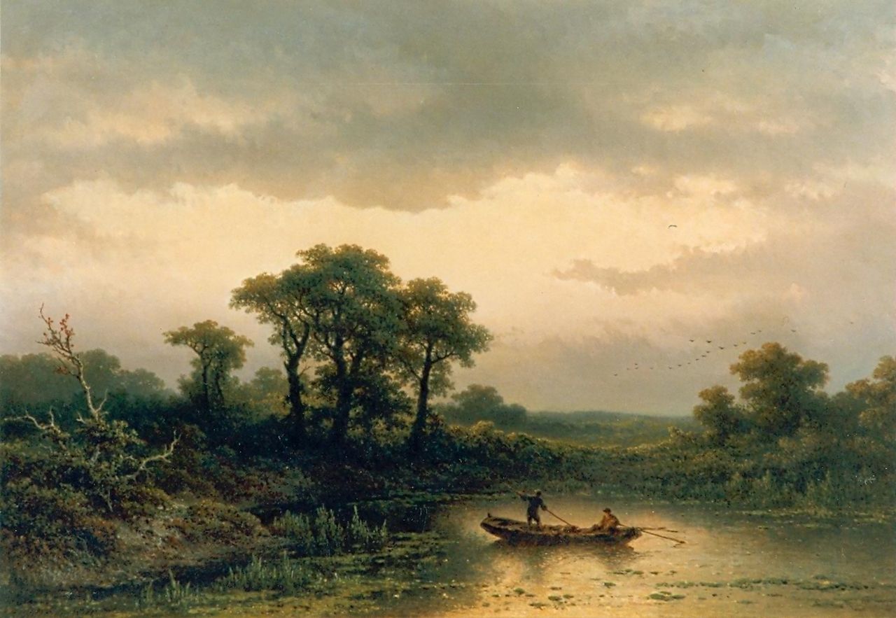 Johannes Hilverdink kunstwerk • schilderij • voorheen te koop Vissers op een plas bij avondschemer