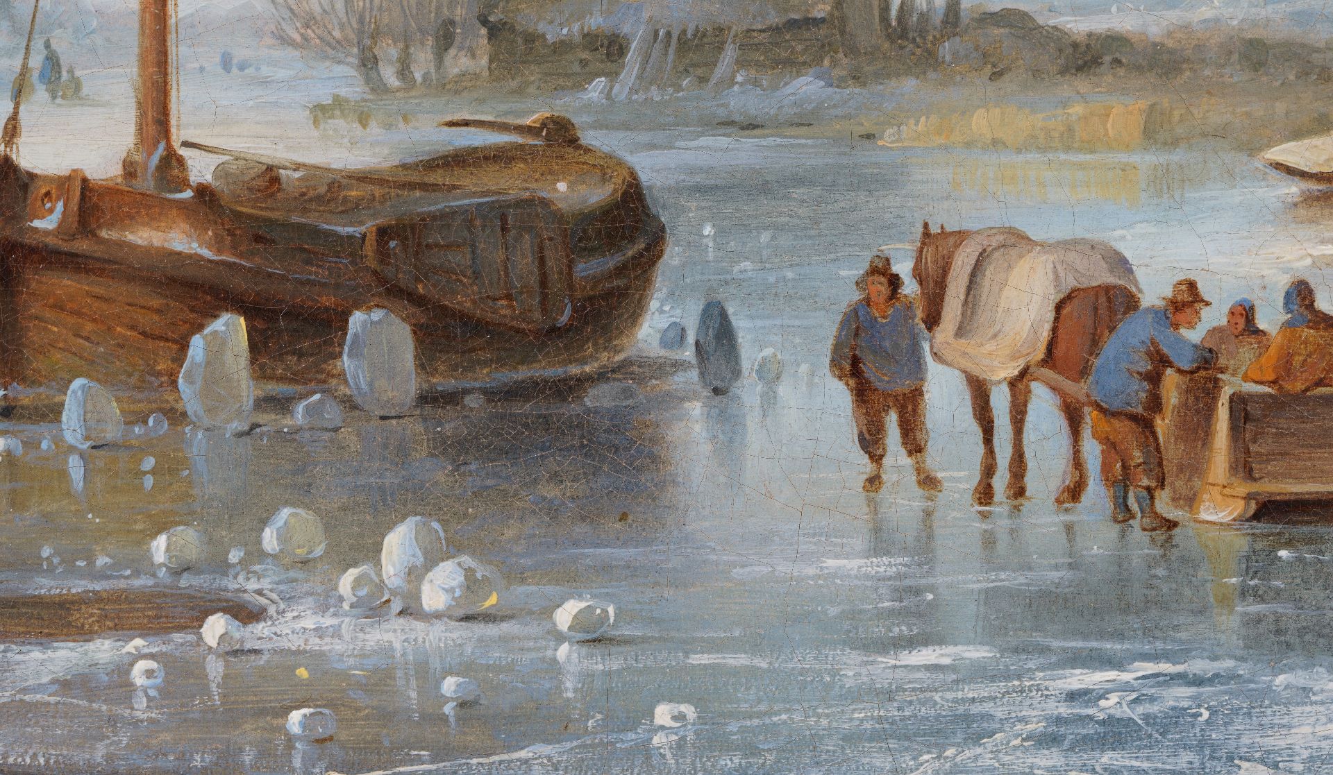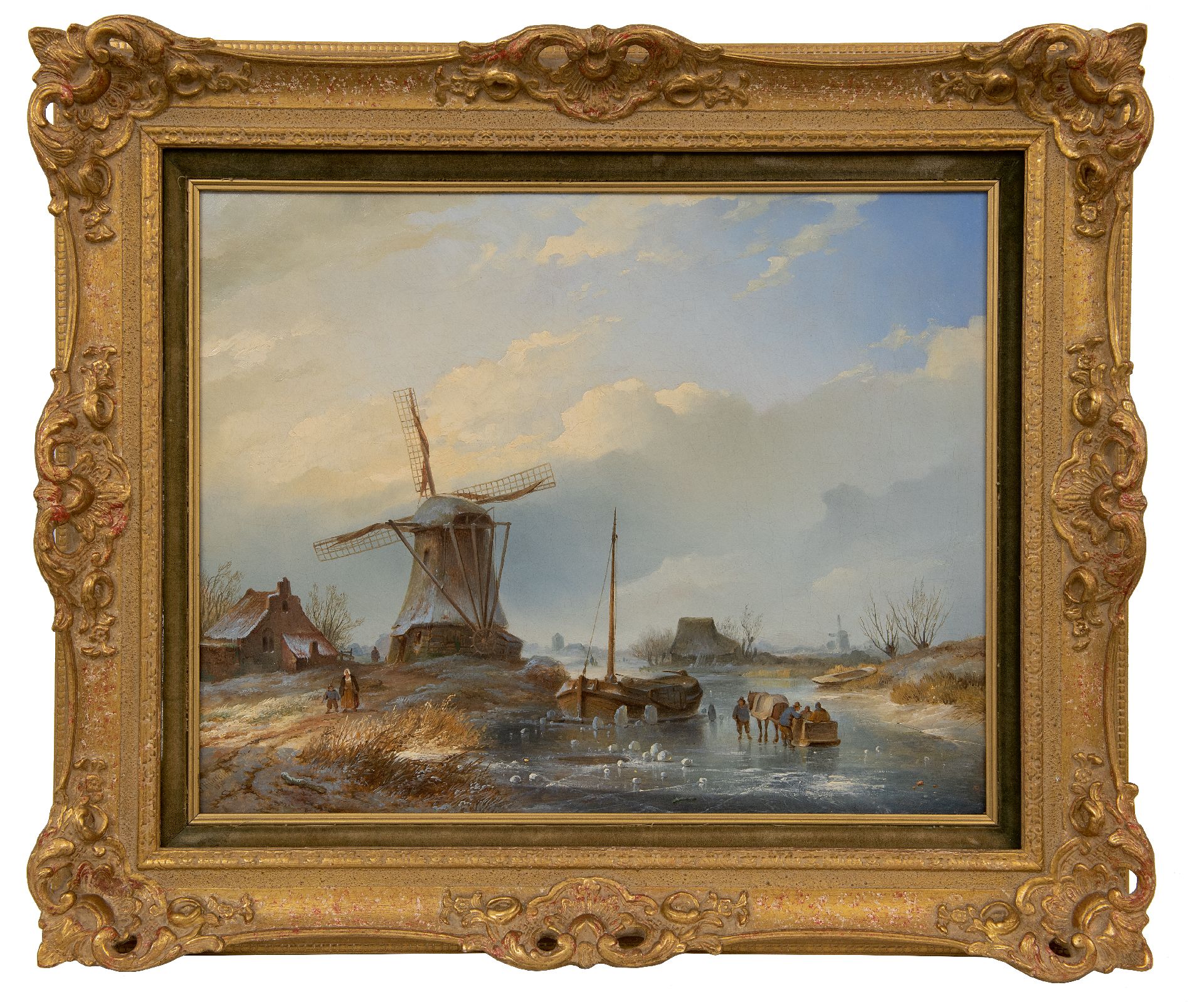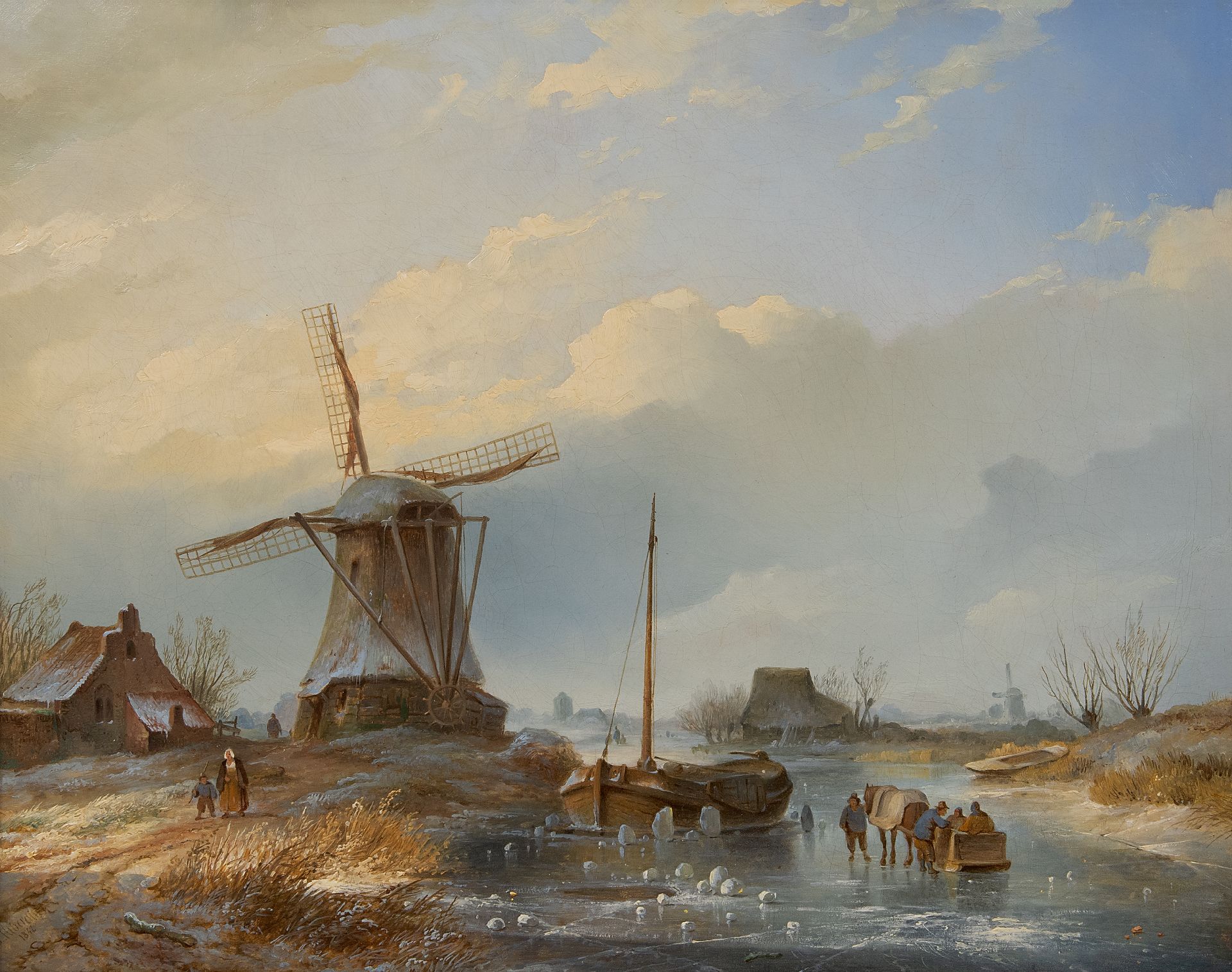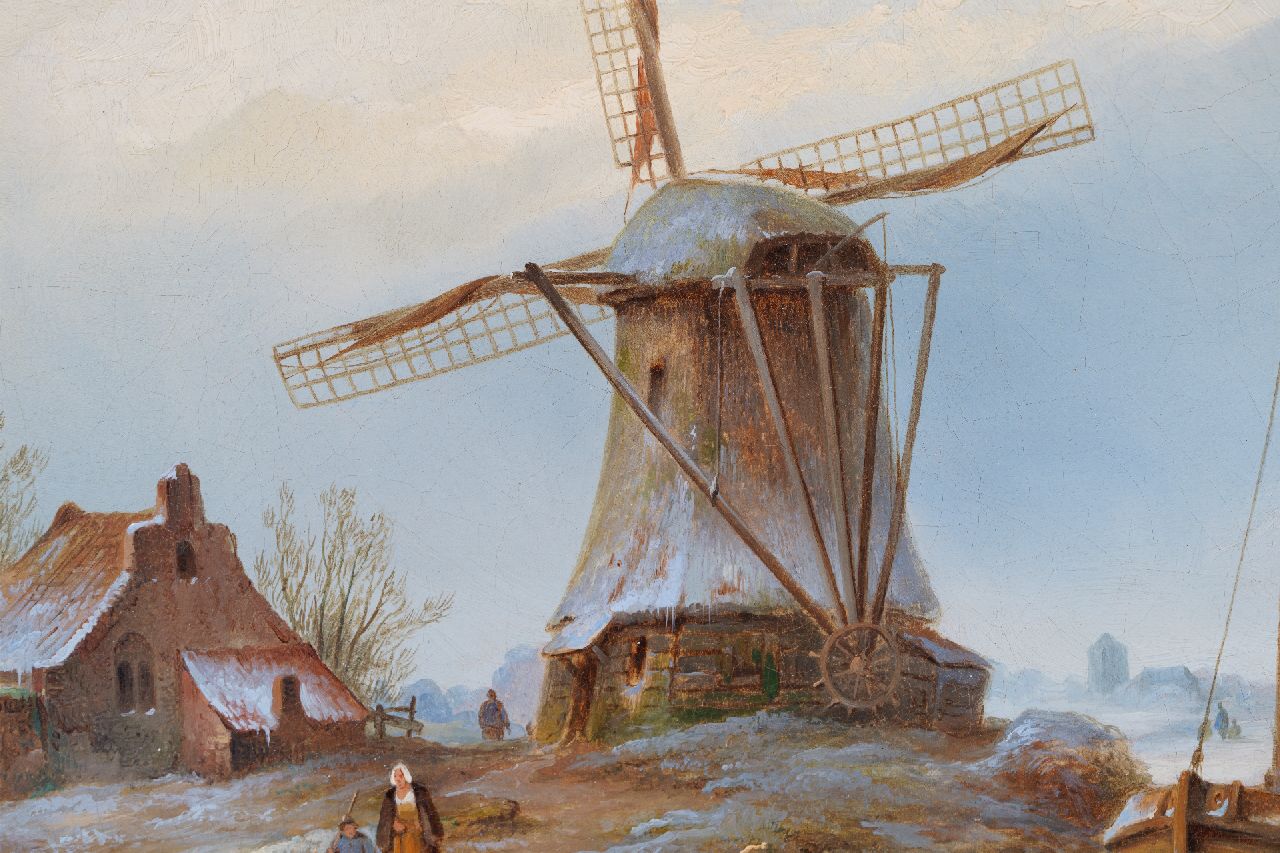 Johannes Hilverdink kunstwerk • schilderij • voorheen te koop Winterlandschap met figuren op het ijs bij een molen