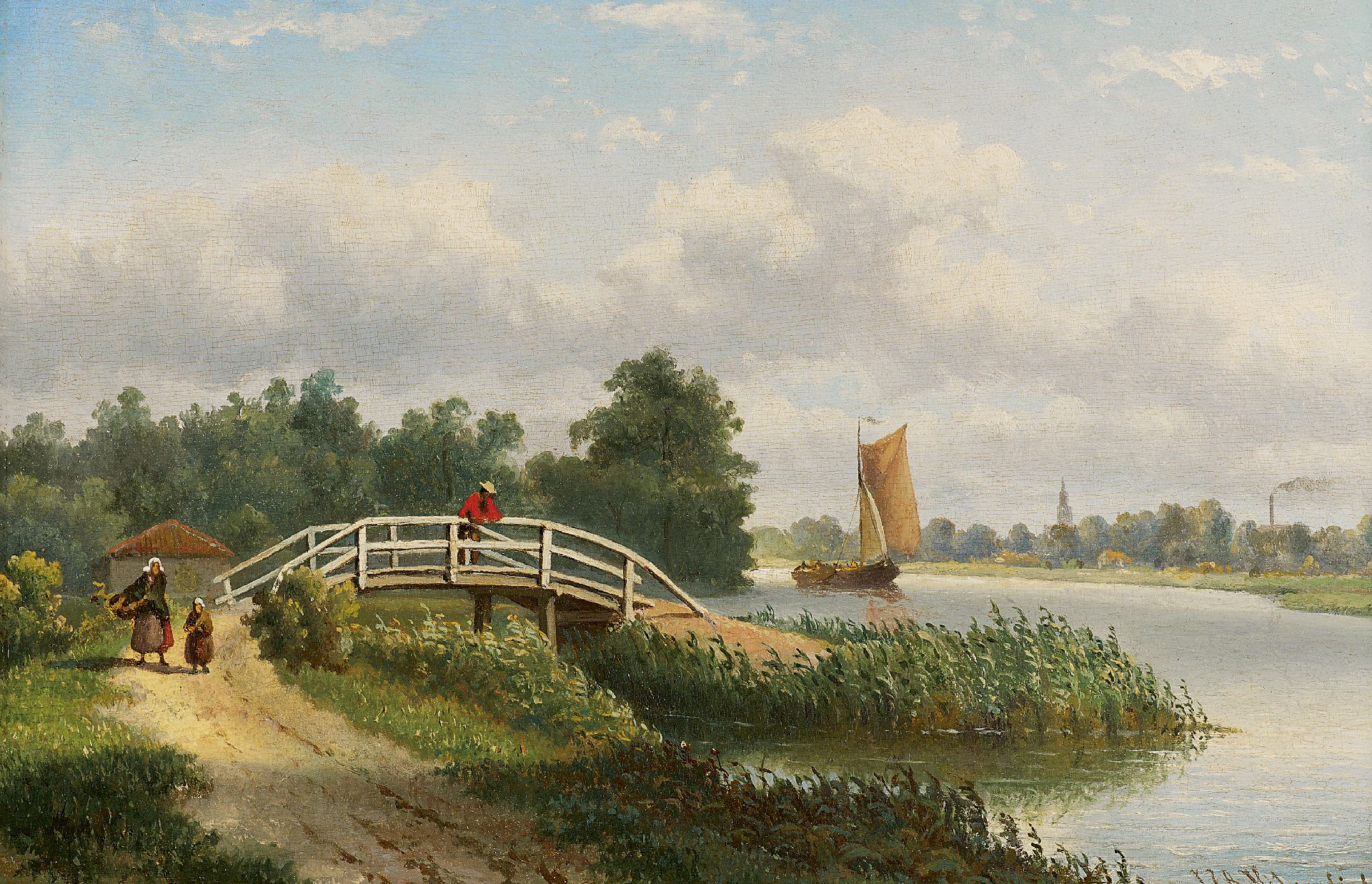 Johannes Jacobus Antonius Hilverdink kunstwerk • schilderij • voorheen te koop Zomerlandschap met figuren langs een rivier
