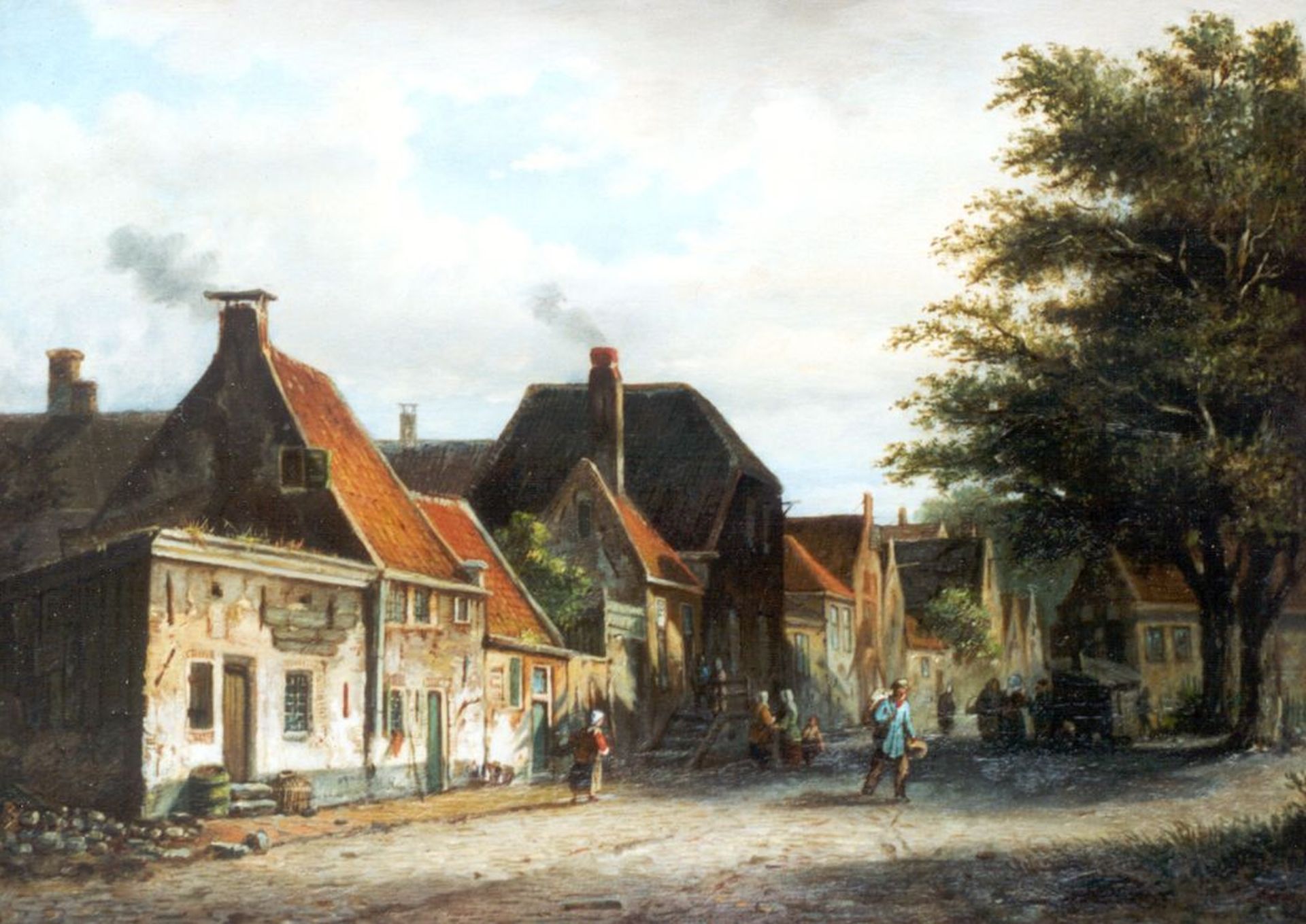 Johannes Jacobus Mittertreiner kunstwerk • schilderij • voorheen te koop Drukbevolkt Oudhollands straatje