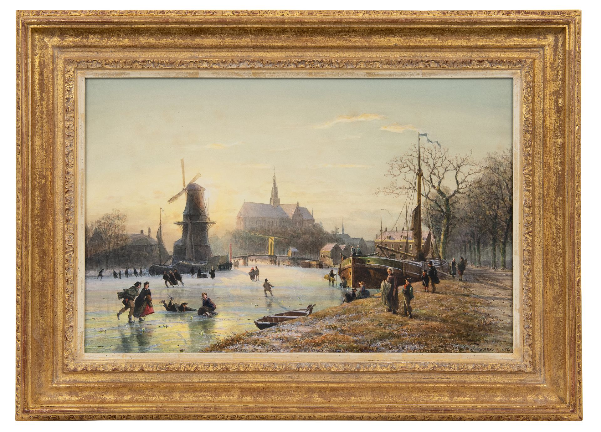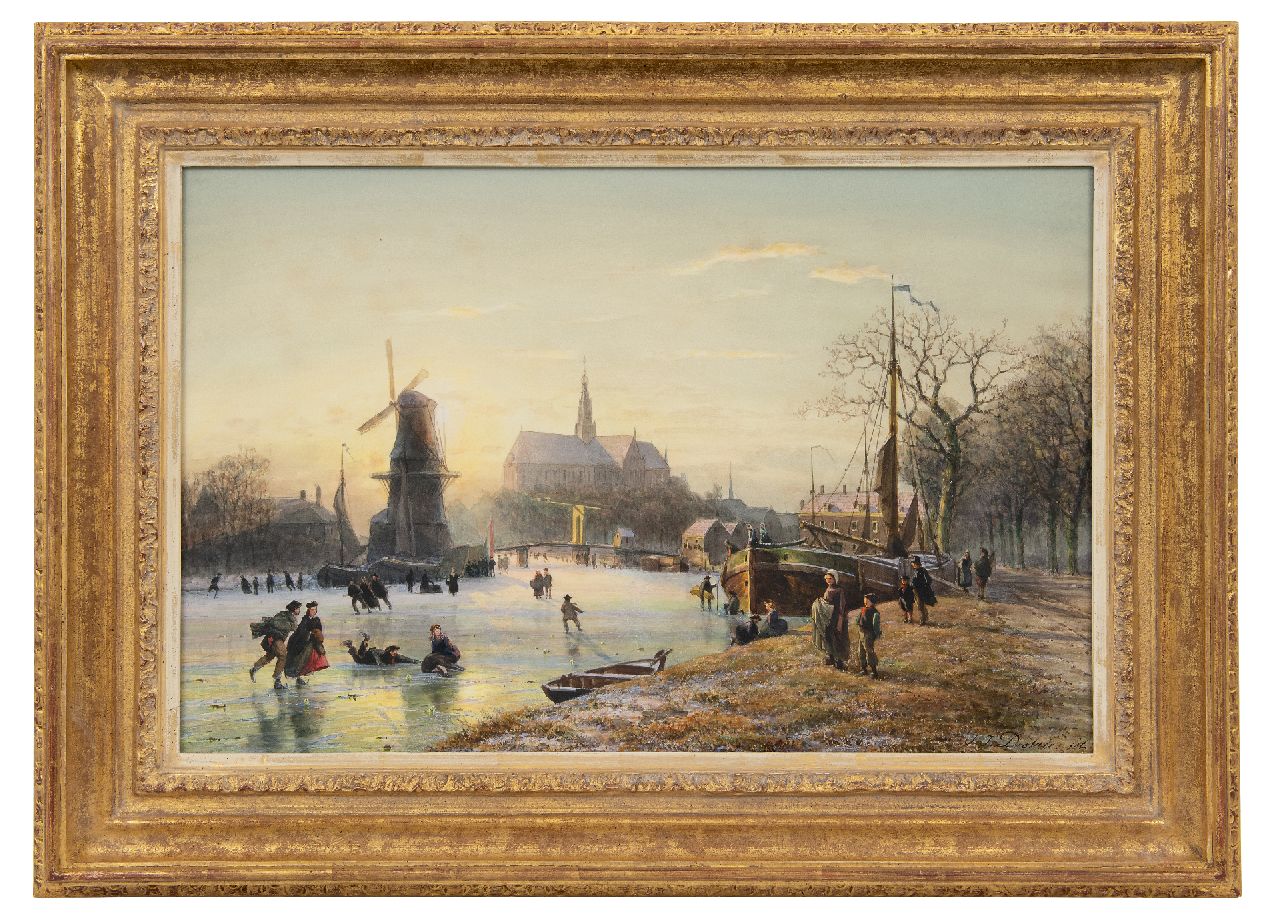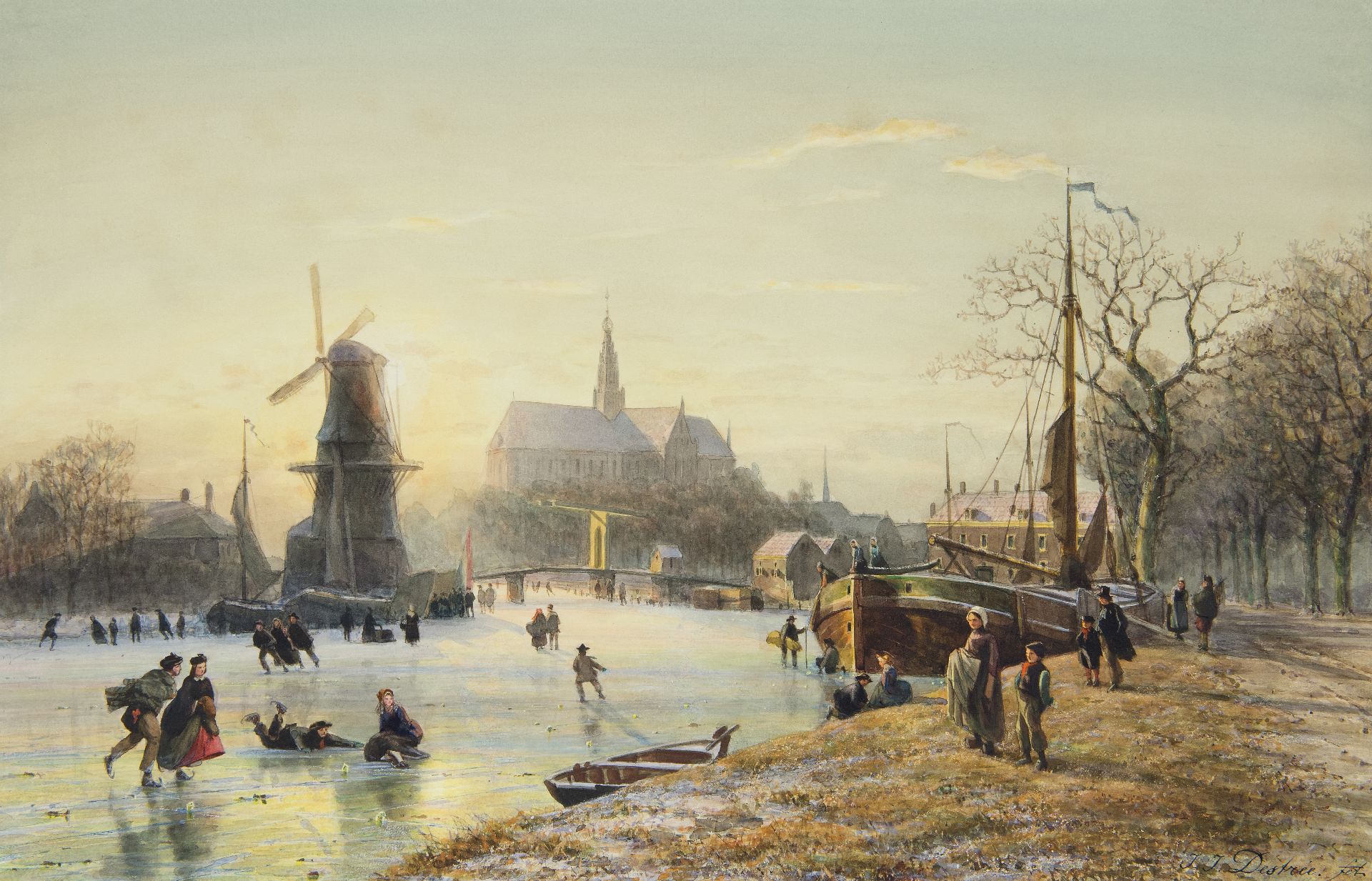 Johannes Josephus Destrée kunstwerk • aquarel • tekening • voorheen te koop Schaatsplezier op het Spaarne met De Adriaan en de St. Bavokerk, Haarlem