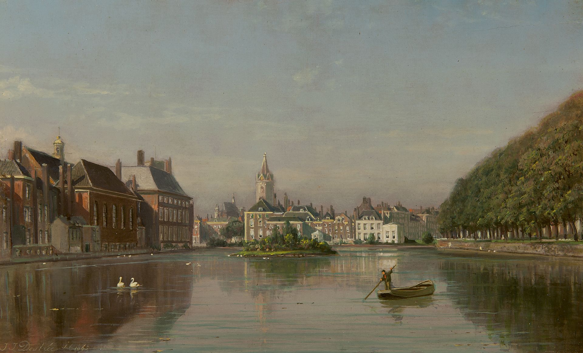 Johannes Josephus Destrée kunstwerk • schilderij • voorheen te koop Gezicht op de Hofvijver, Den Haag