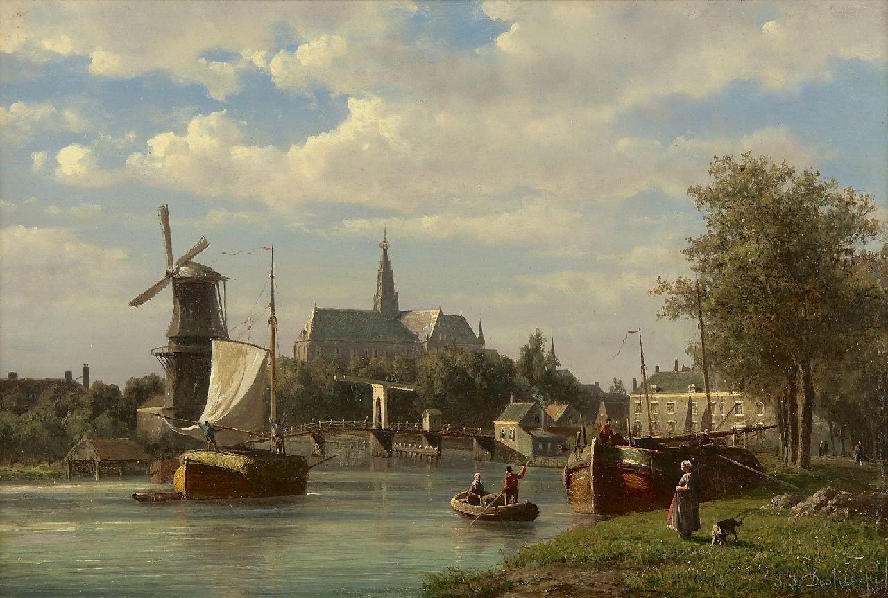 Johannes Josephus Destrée kunstwerk • schilderij • voorheen te koop Het Spaarne en de St. Bavokerk, Haarlem