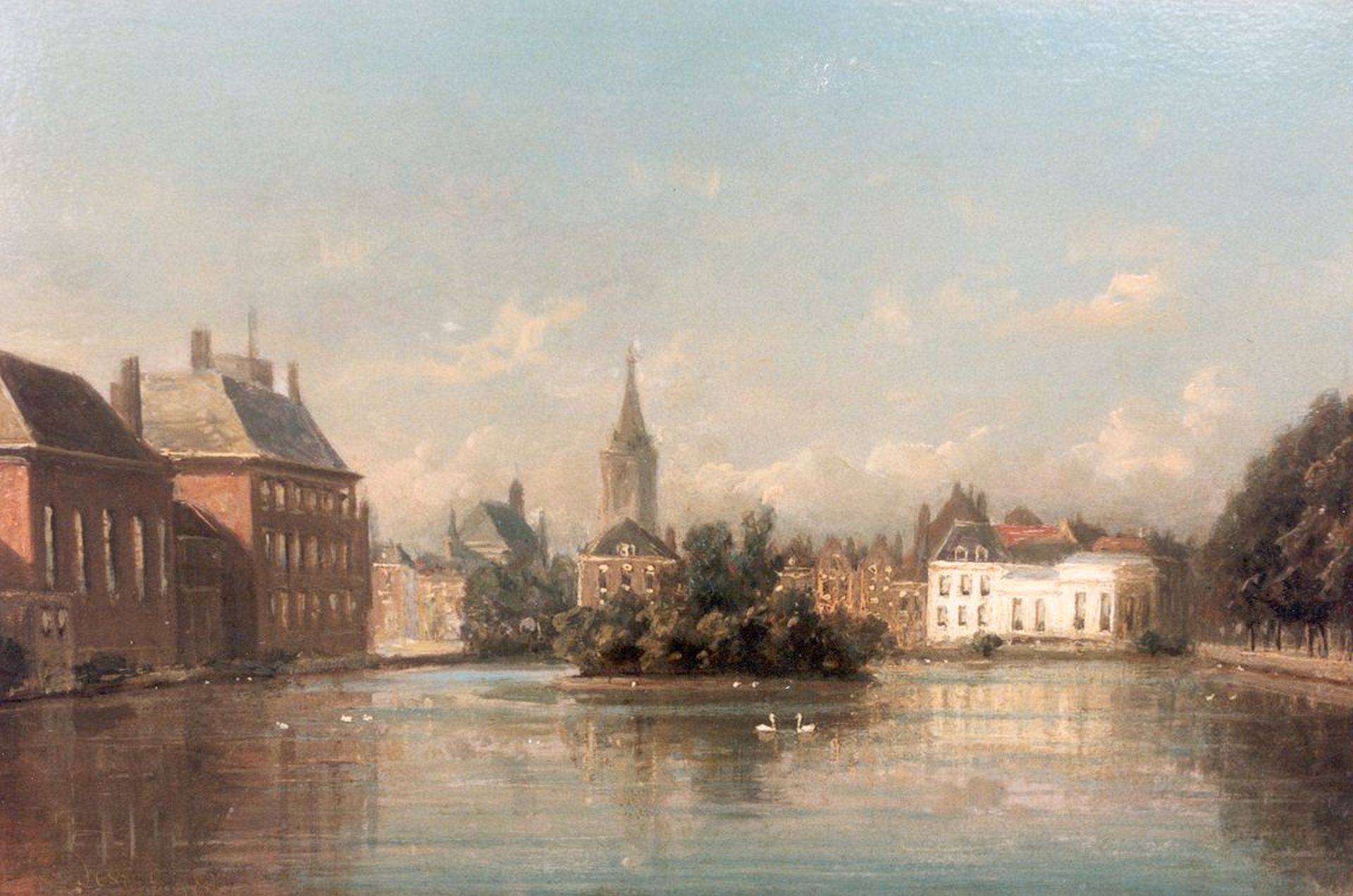 Johannes Josephus Destrée kunstwerk • schilderij • voorheen te koop Stadsgezichtje; hofvijver den haag
