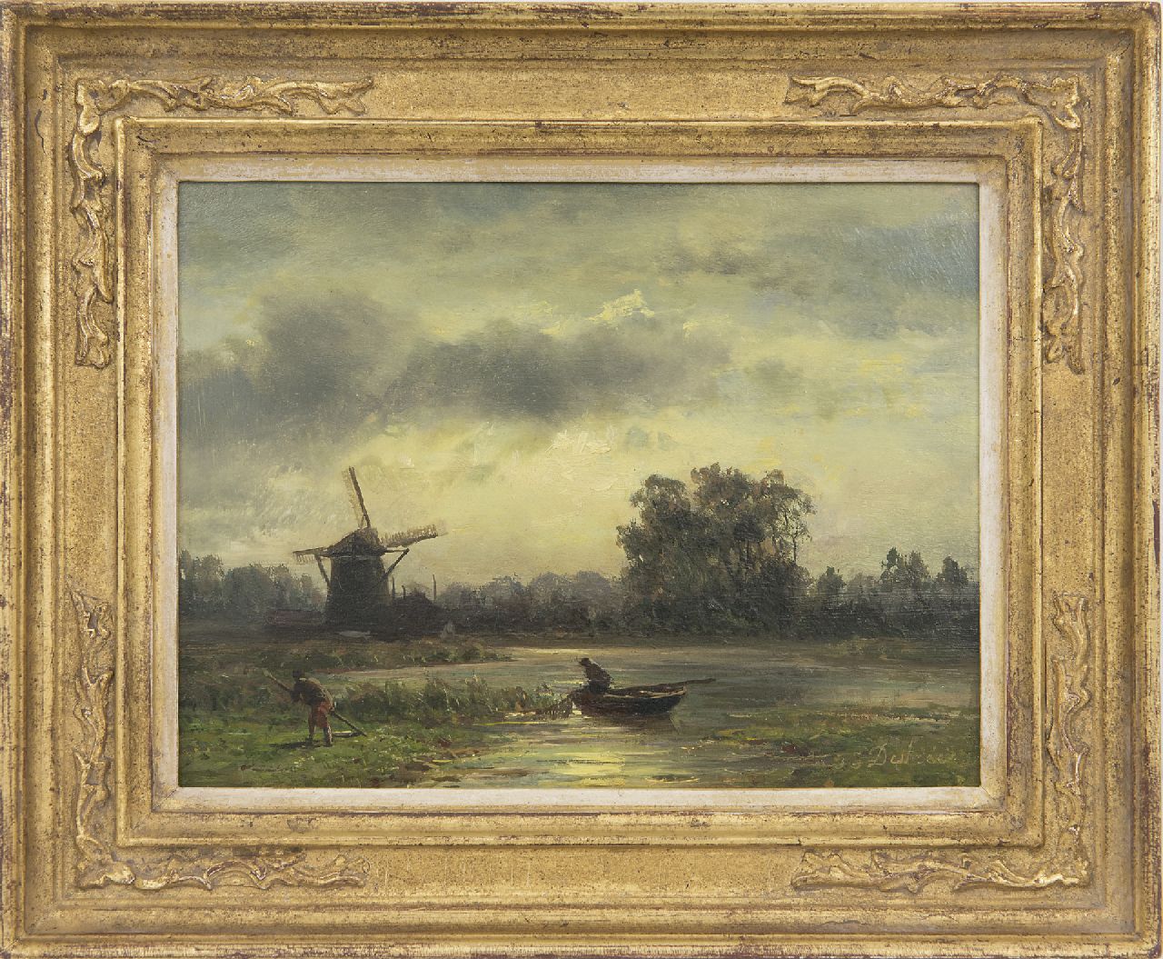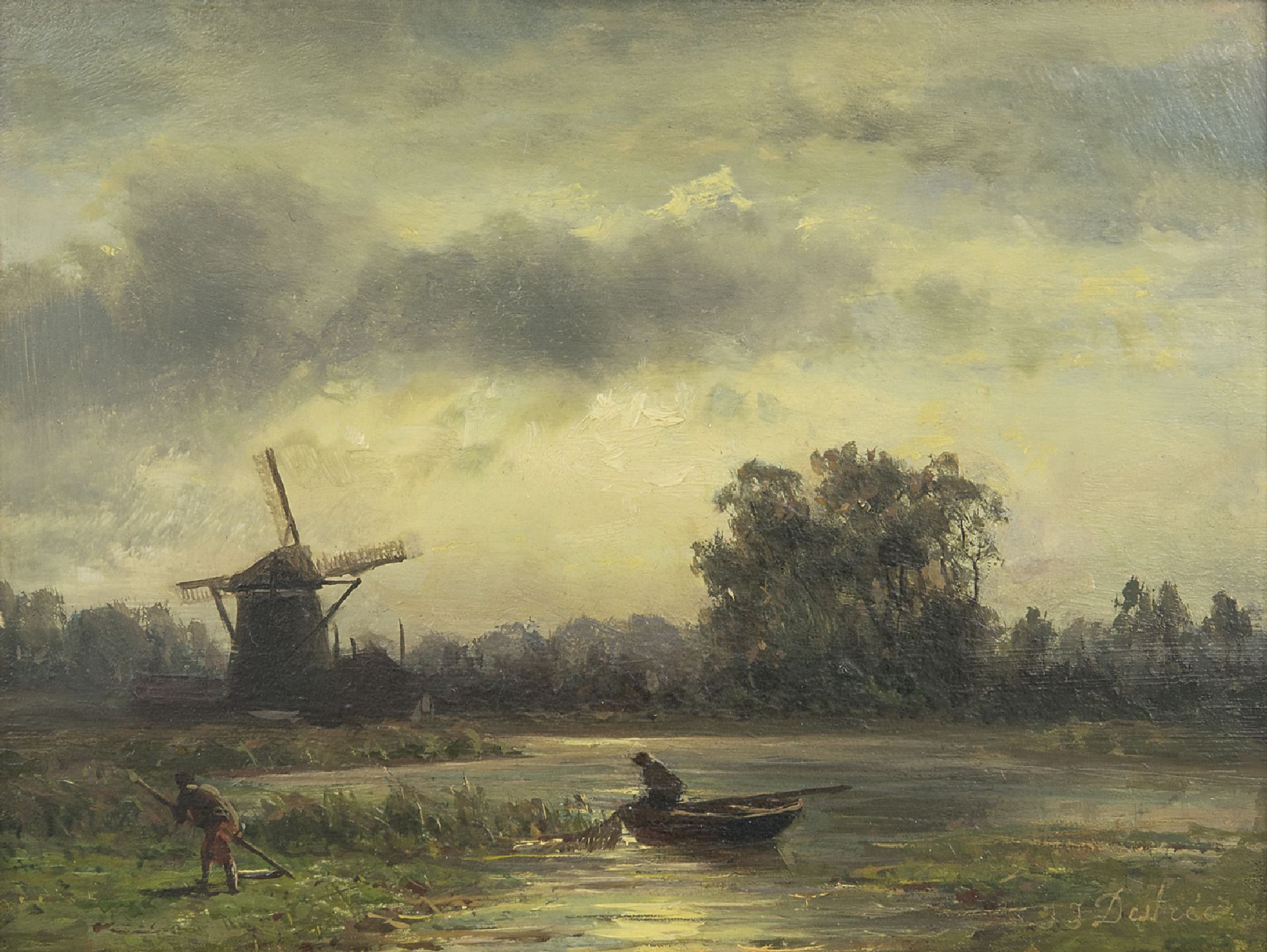 Johannes Josephus Destrée kunstwerk • schilderij • voorheen te koop Waterlandschap met maaiende boer en visser bij een molen