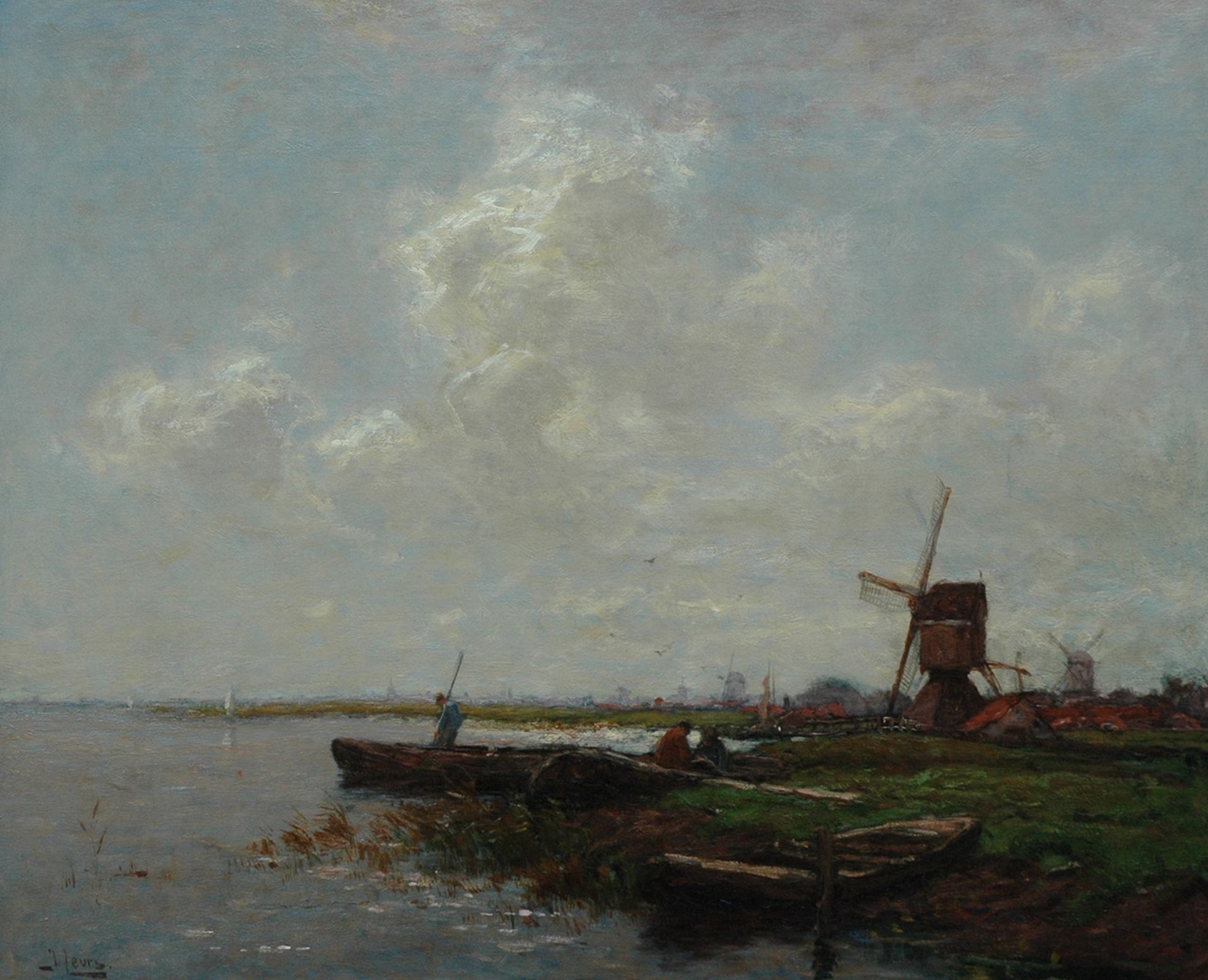 Johannes Karel Leurs kunstwerk • schilderij • voorheen te koop Polderlandschap met pramen en wipmolen
