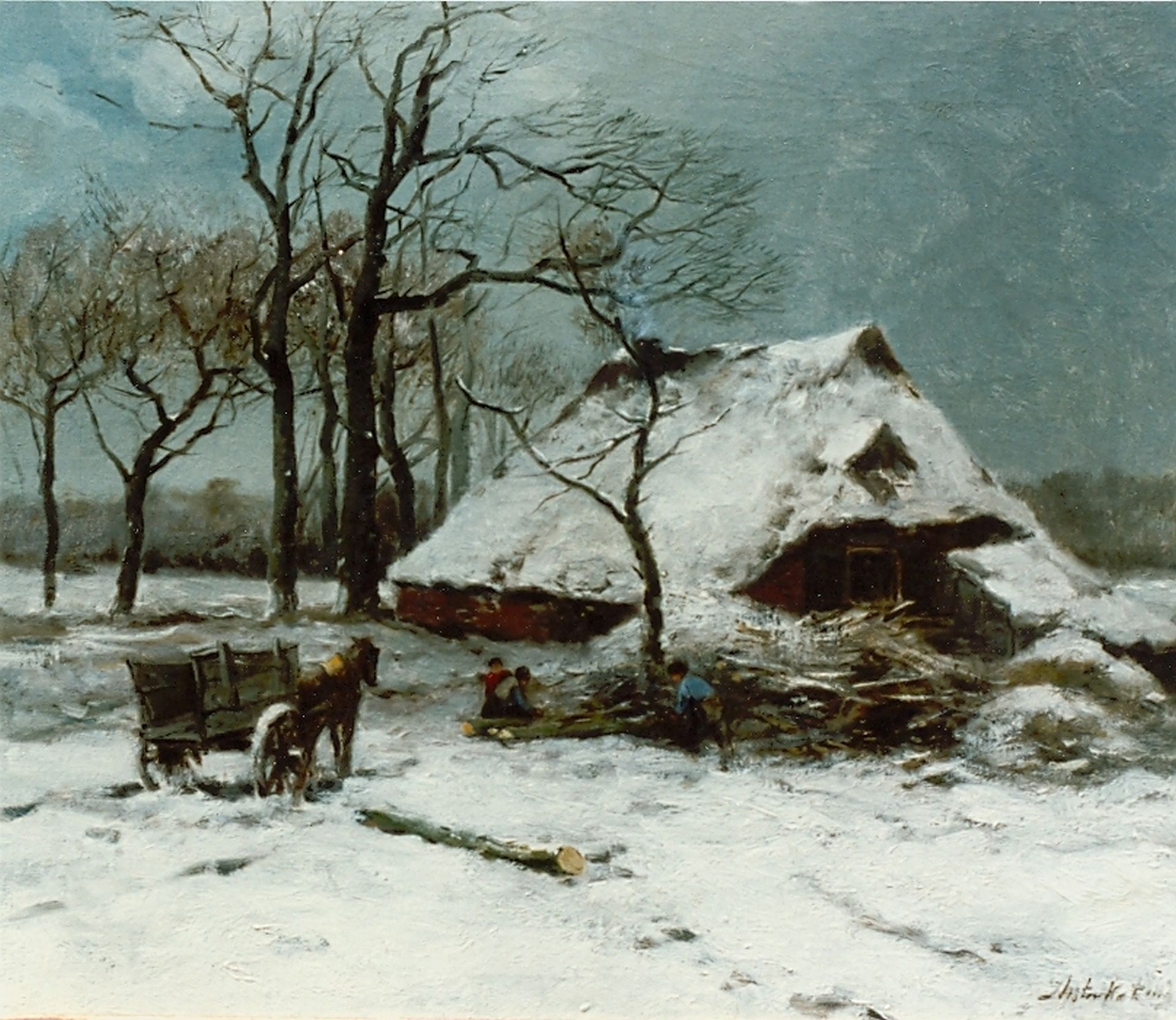 Johannes Marius ten Kate kunstwerk • schilderij • voorheen te koop Sprokkelaars bij besneeuwde boerderij