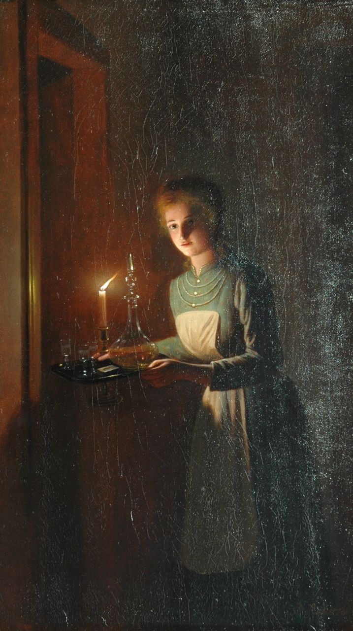 Johannes Rosierse kunstwerk • schilderij • voorheen te koop Dienstertje met karaf bij kaarslicht