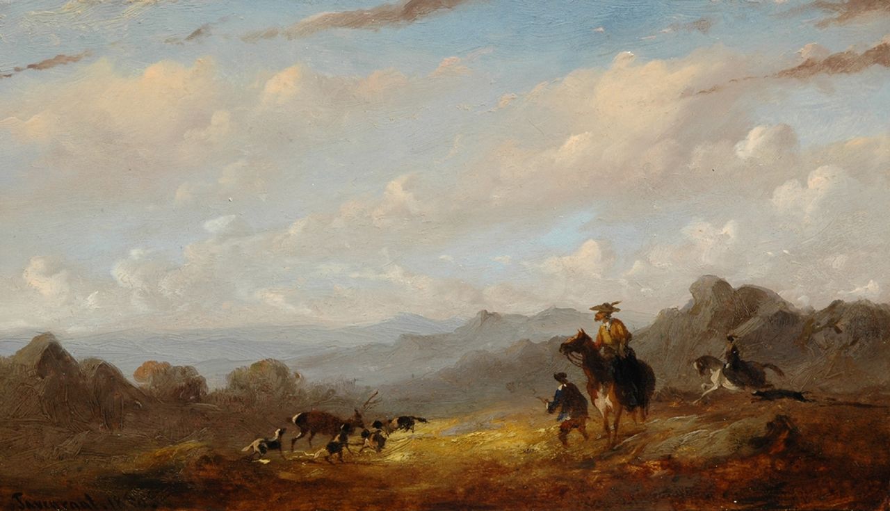 Johannes Tavenraat kunstwerk • schilderij • voorheen te koop Hertenjacht in weids heuvellandschap
