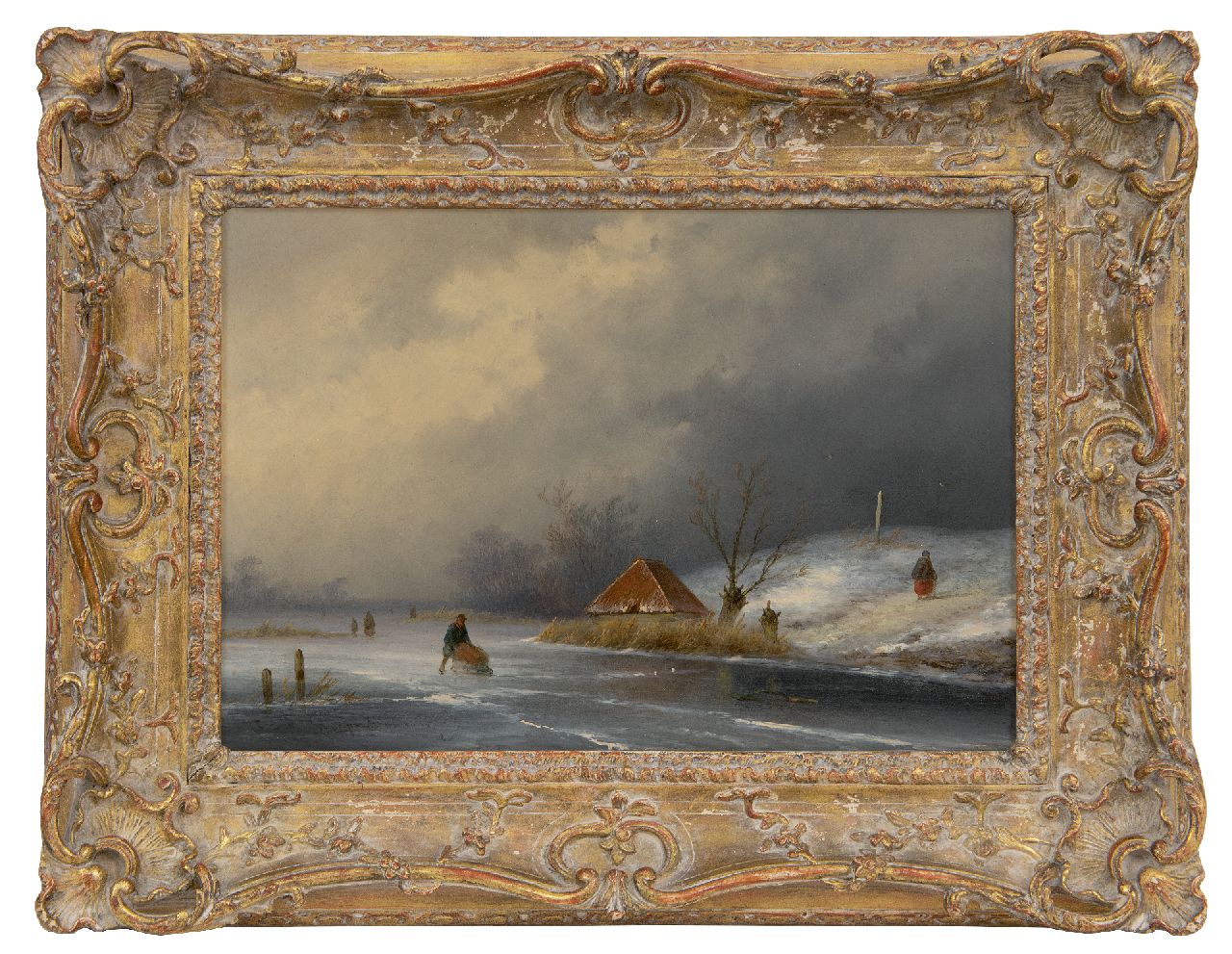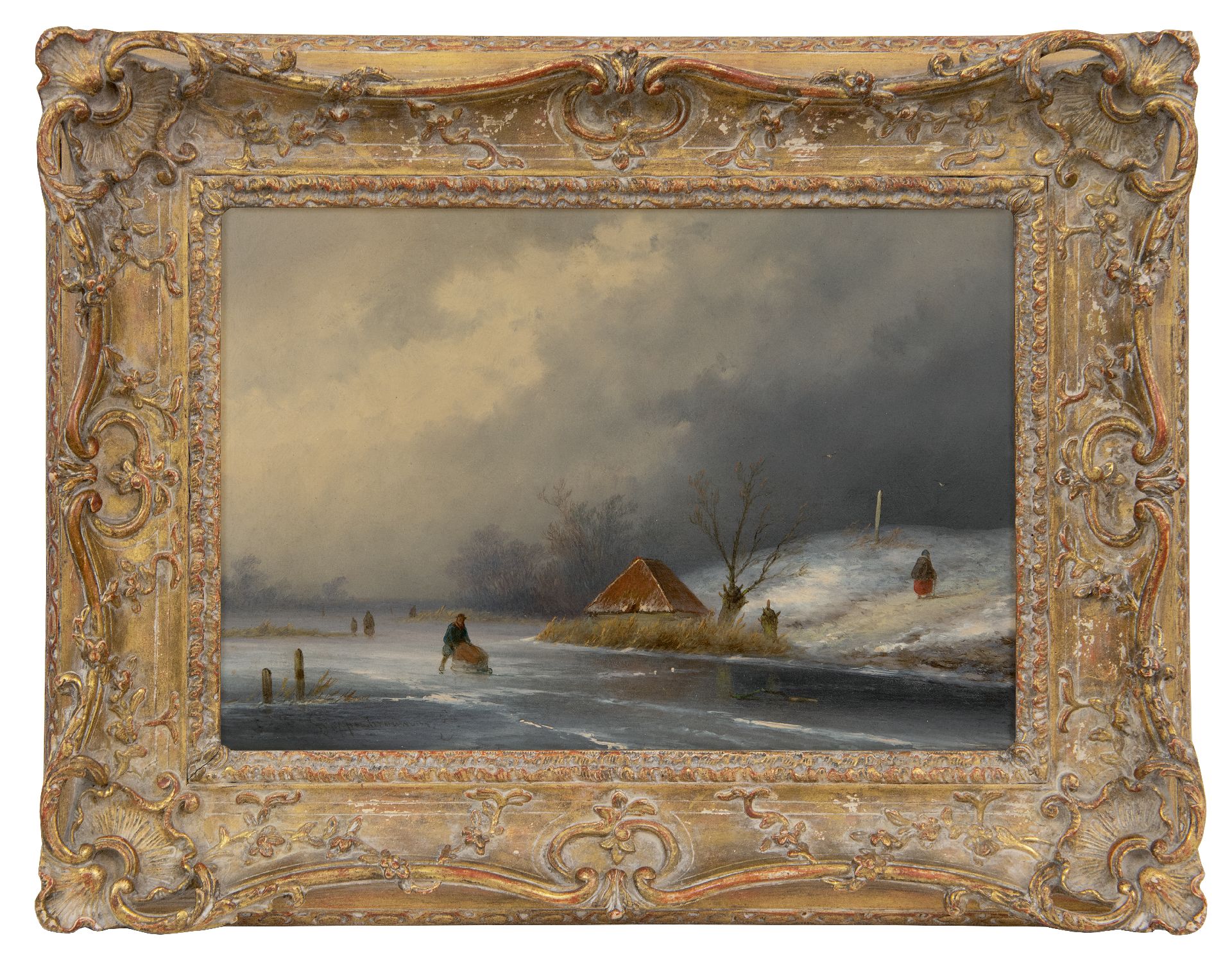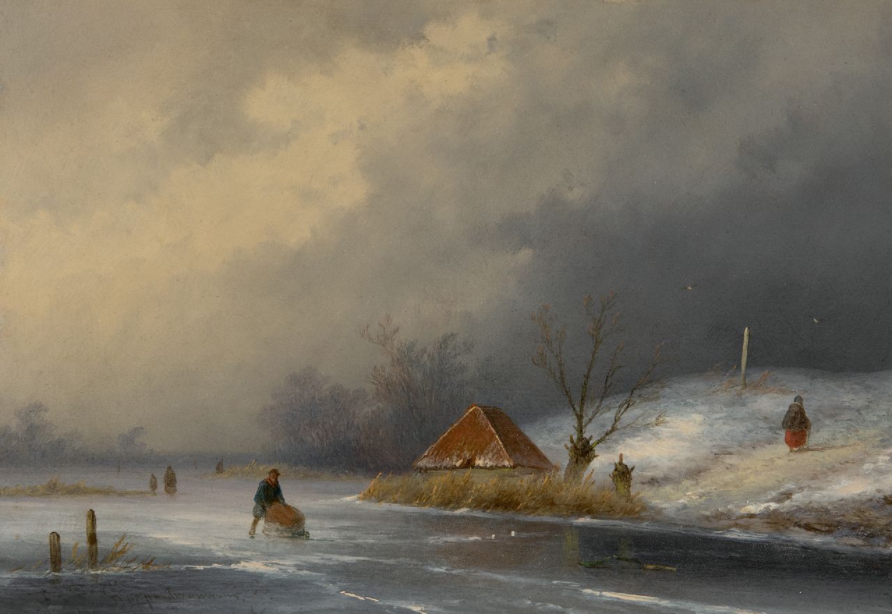 John Franciscus Hoppenbrouwers kunstwerk • schilderij • voorheen te koop Figuren op het ijs bij naderende sneeuwstorm