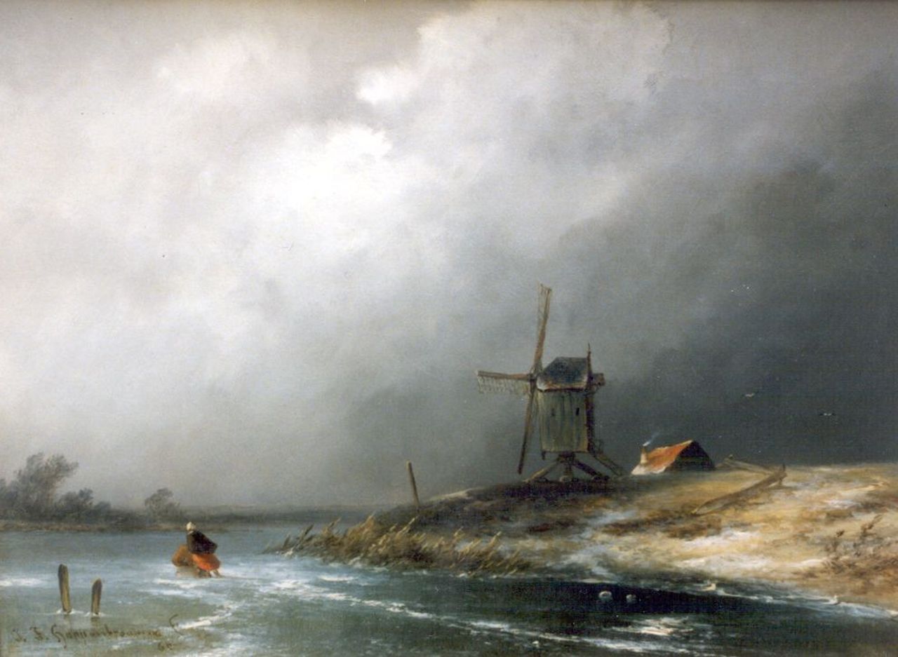 John Franciscus Hoppenbrouwers kunstwerk • schilderij • voorheen te koop IJsgezicht met schaatser en molen