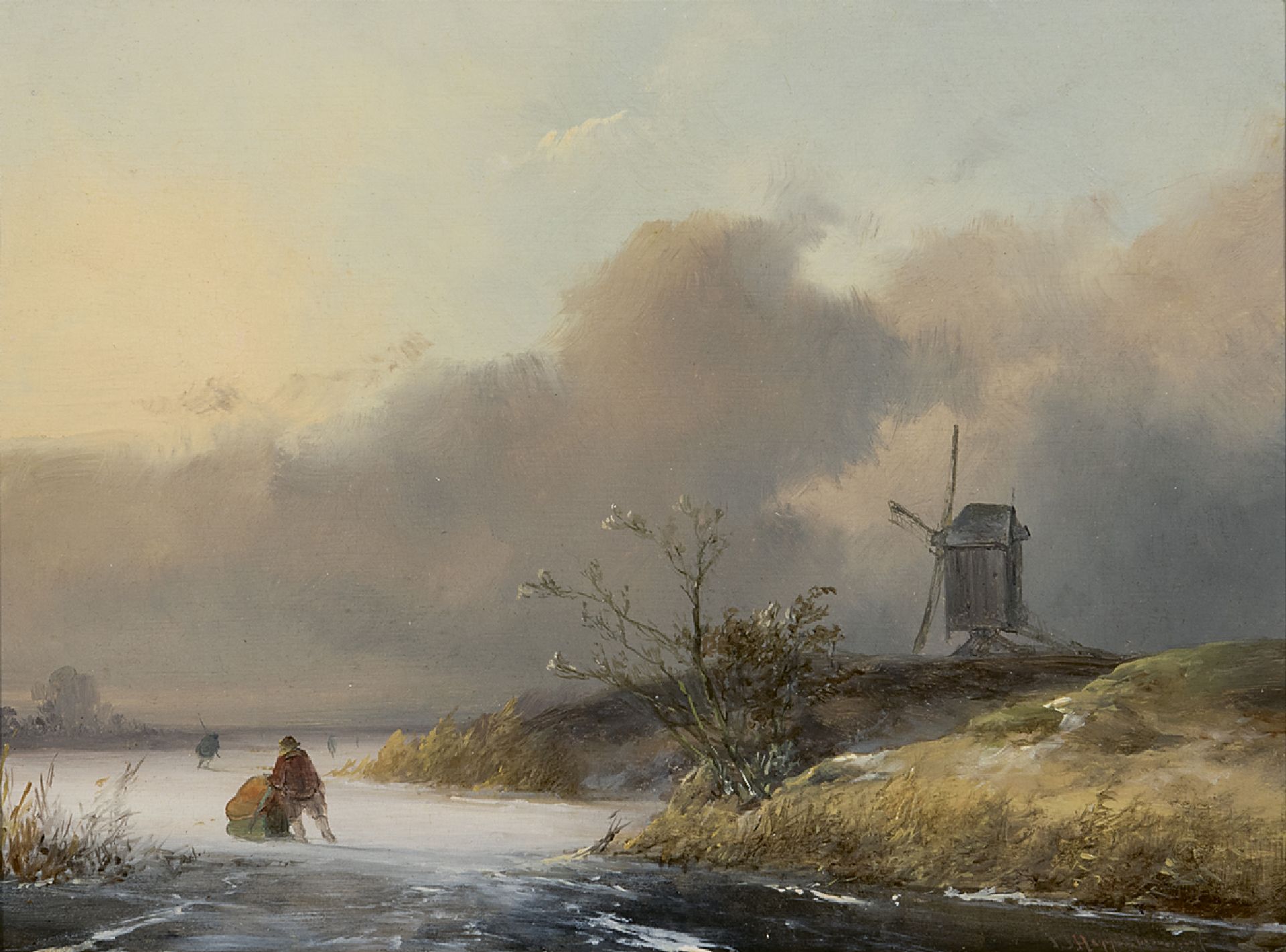 John Franciscus Hoppenbrouwers kunstwerk • schilderij • voorheen te koop Schaatsers op een winterse vaart