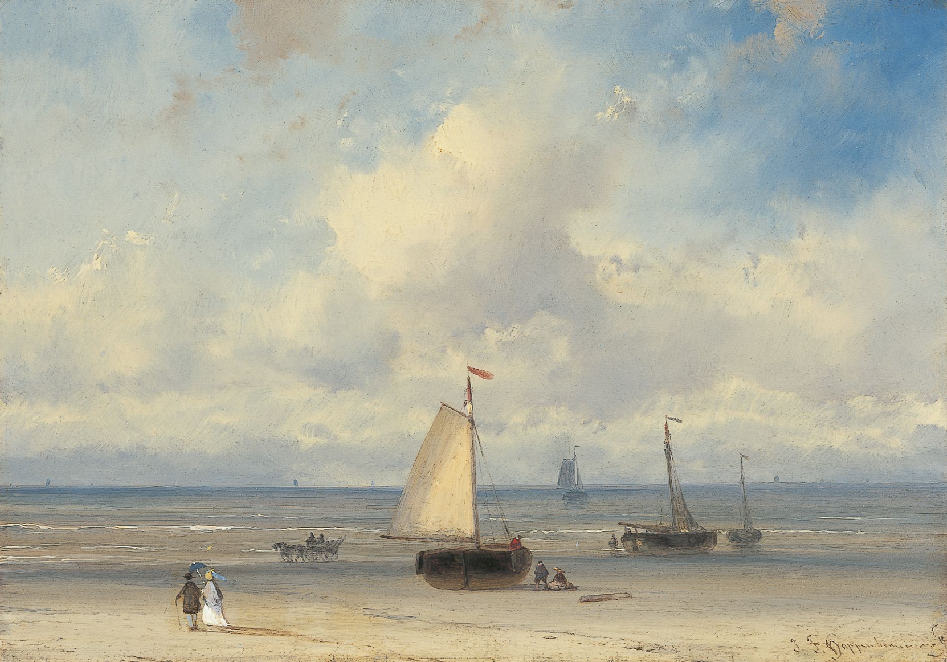 John Franciscus Hoppenbrouwers kunstwerk • schilderij • voorheen te koop Vissers en elegante wandelaars bij bomschuiten op het strand