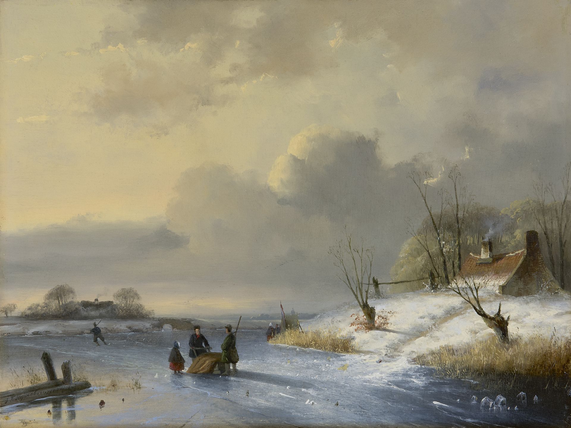 John Franciscus Hoppenbrouwers kunstwerk • schilderij • voorheen te koop Winterlandschap met schaatsers