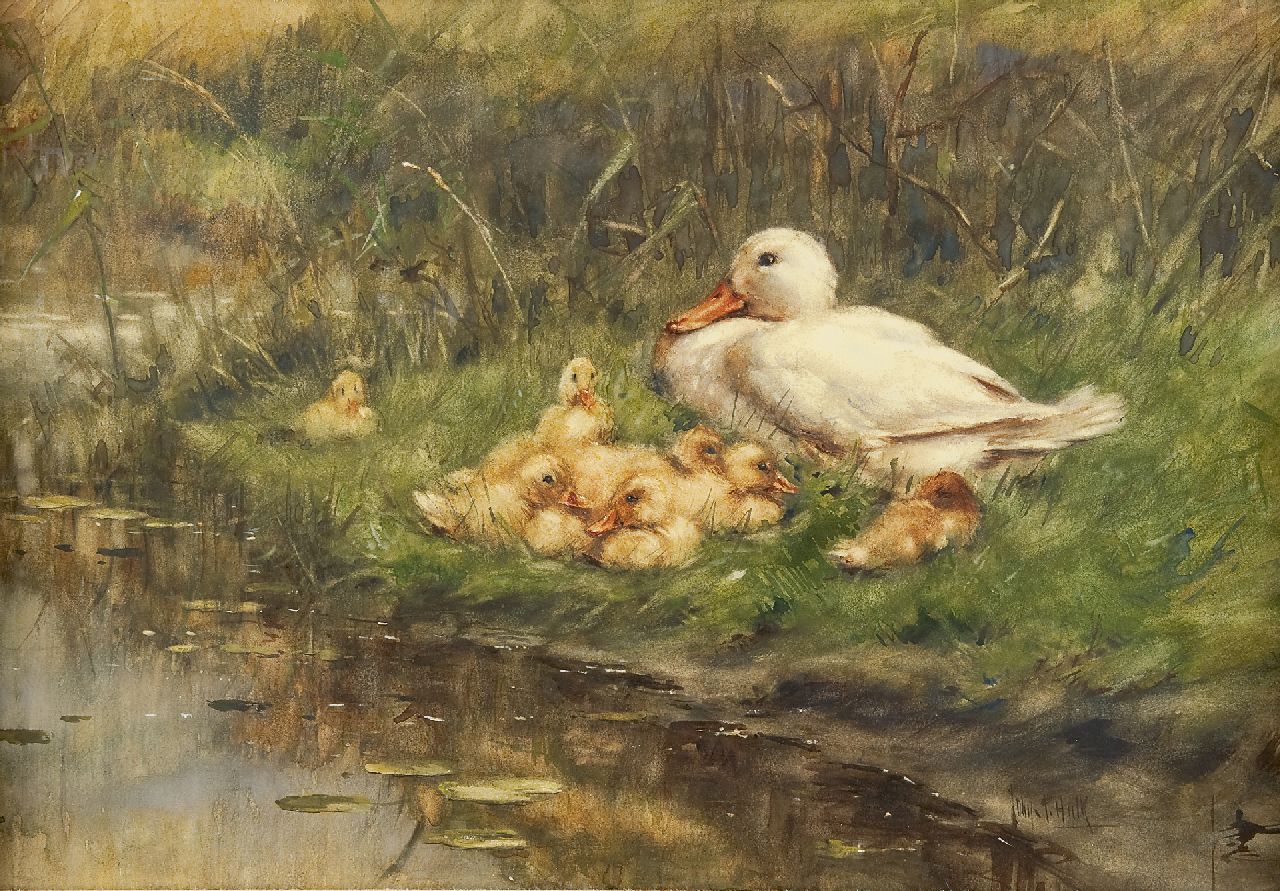 Hulk jr. J.F.  | Johannes Frederik 'John' Hulk jr., Moedereend met kuikens op de oever, aquarel op papier 42,5 x 62,6 cm, gesigneerd rechtsonder
