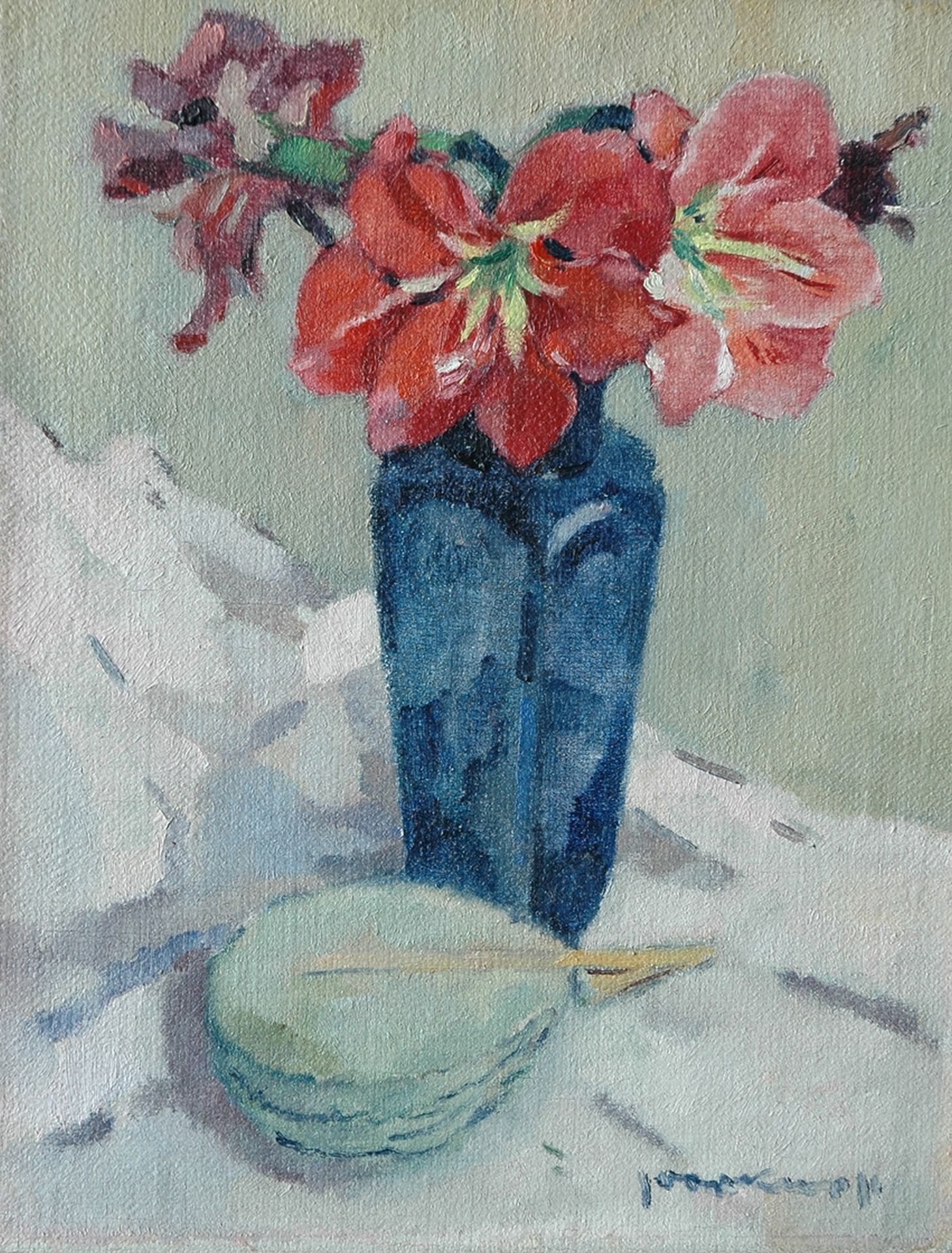 Joop Kropff kunstwerk • schilderij • voorheen te koop Amaryllis in hoge blauwe vaas