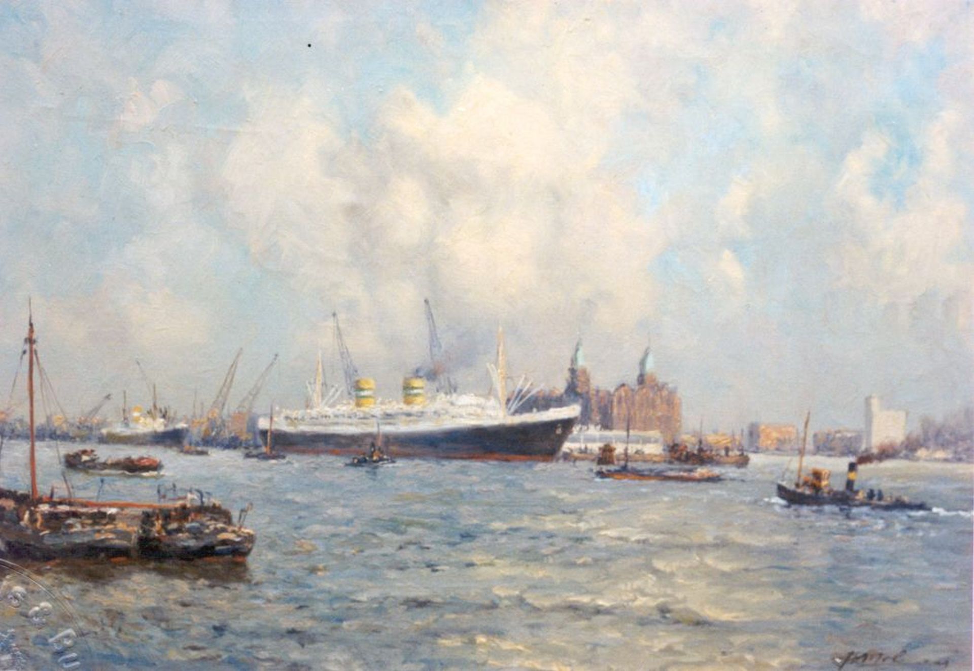 Joop Molenaar kunstwerk • schilderij • voorheen te koop Gezicht op de Maas te Rotterdam met het H.A.L. gebouw