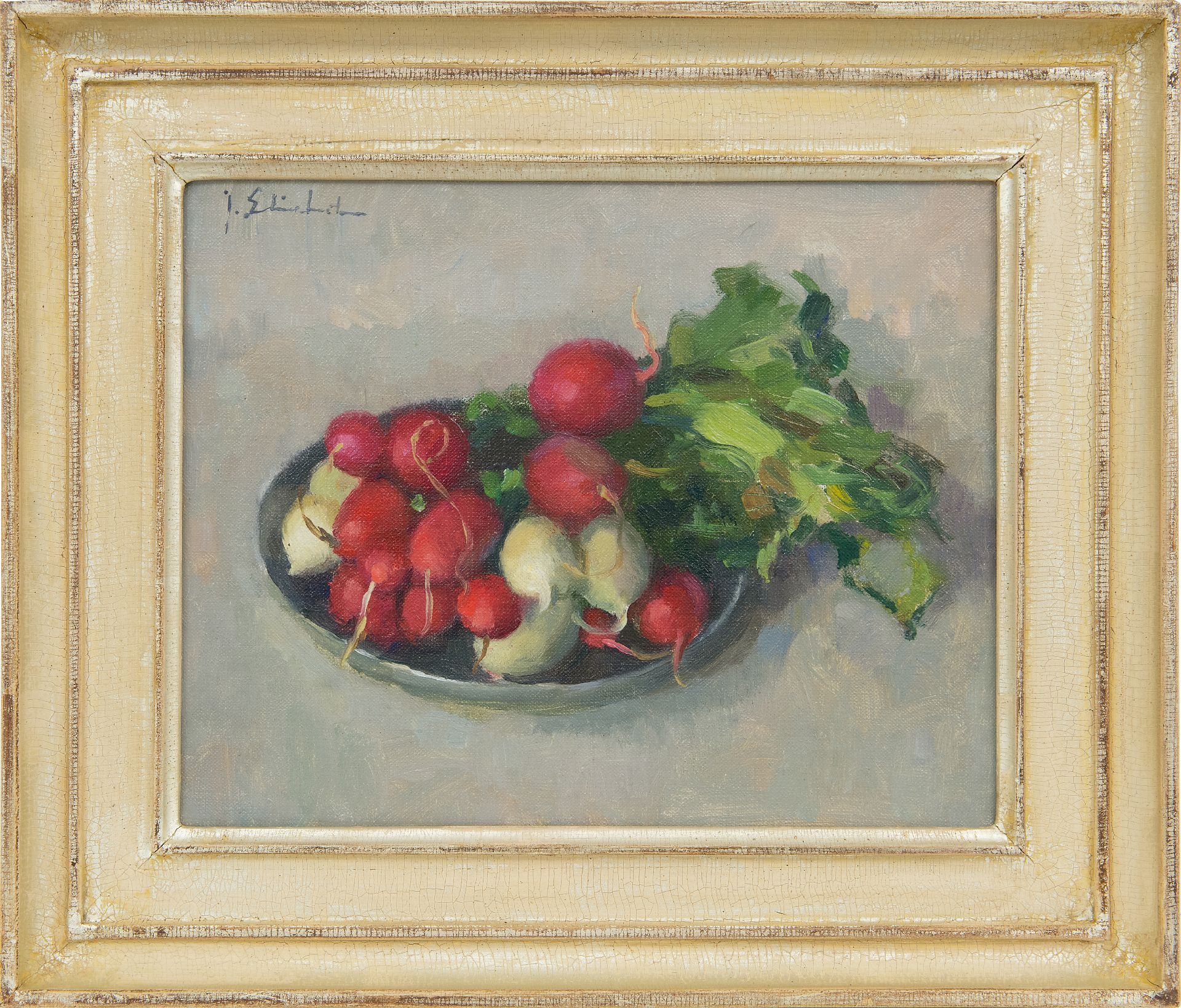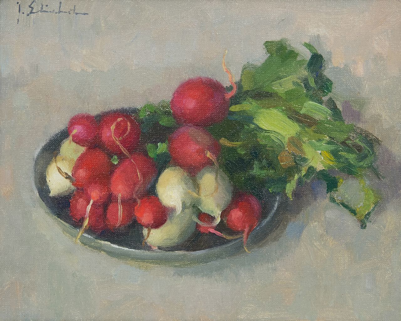 Joop Stierhout kunstwerk • schilderij • voorheen te koop Rode en witte radijs op een schotel