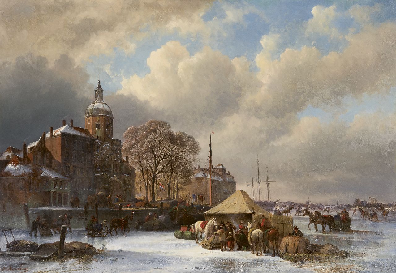 Joseph Moerenhout kunstwerk • schilderij • voorheen te koop Drukbevolkt ijsgezicht bij het Groothoofd in Dordrecht