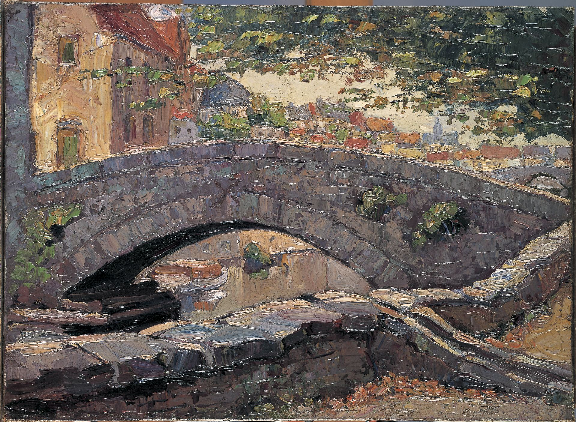 Joseph Raphael kunstwerk • schilderij • voorheen te koop Gezicht op de Meebrug te Brugge