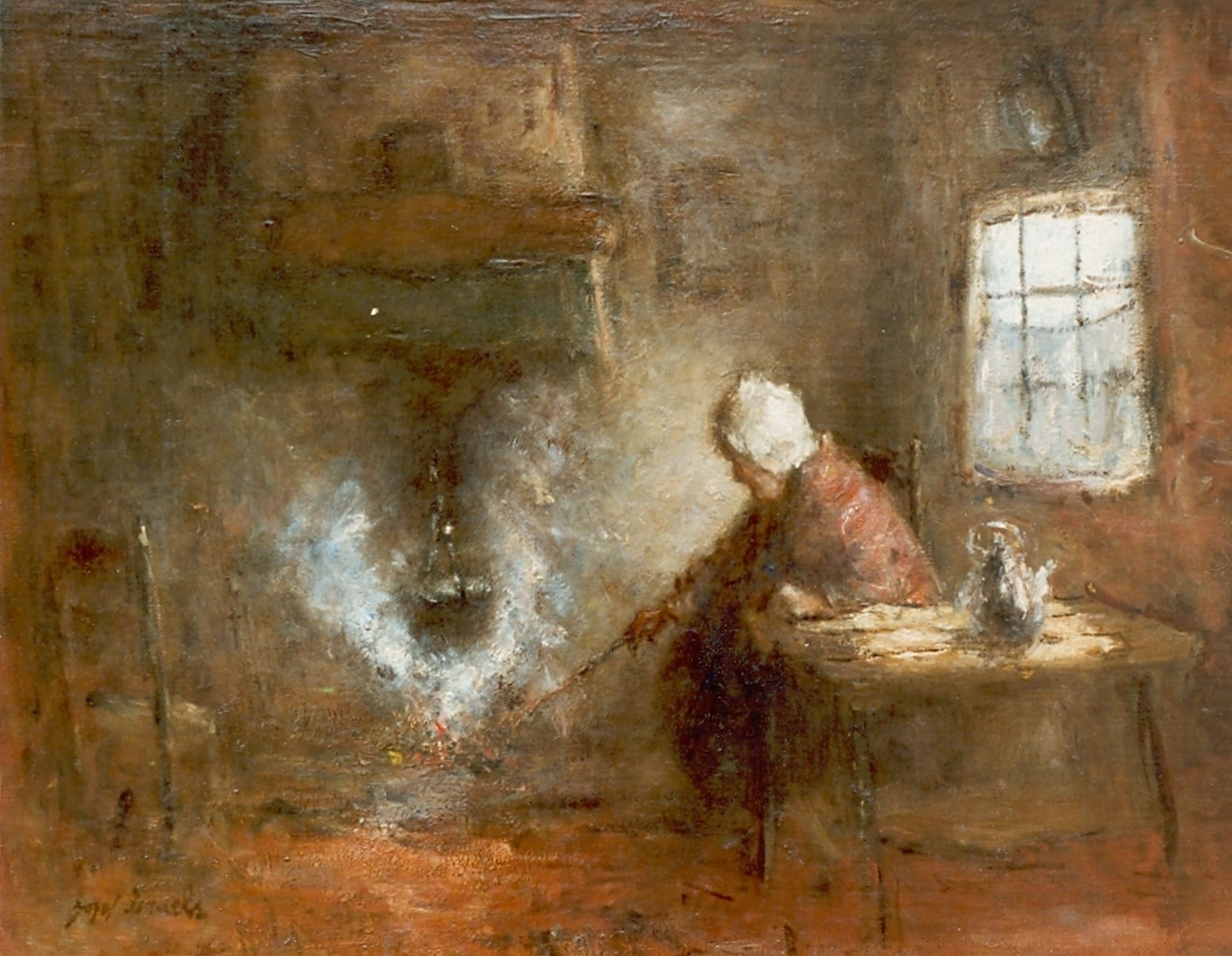 Jozef Israëls kunstwerk • schilderij • voorheen te koop Interieur met oude vrouw bij kookpot