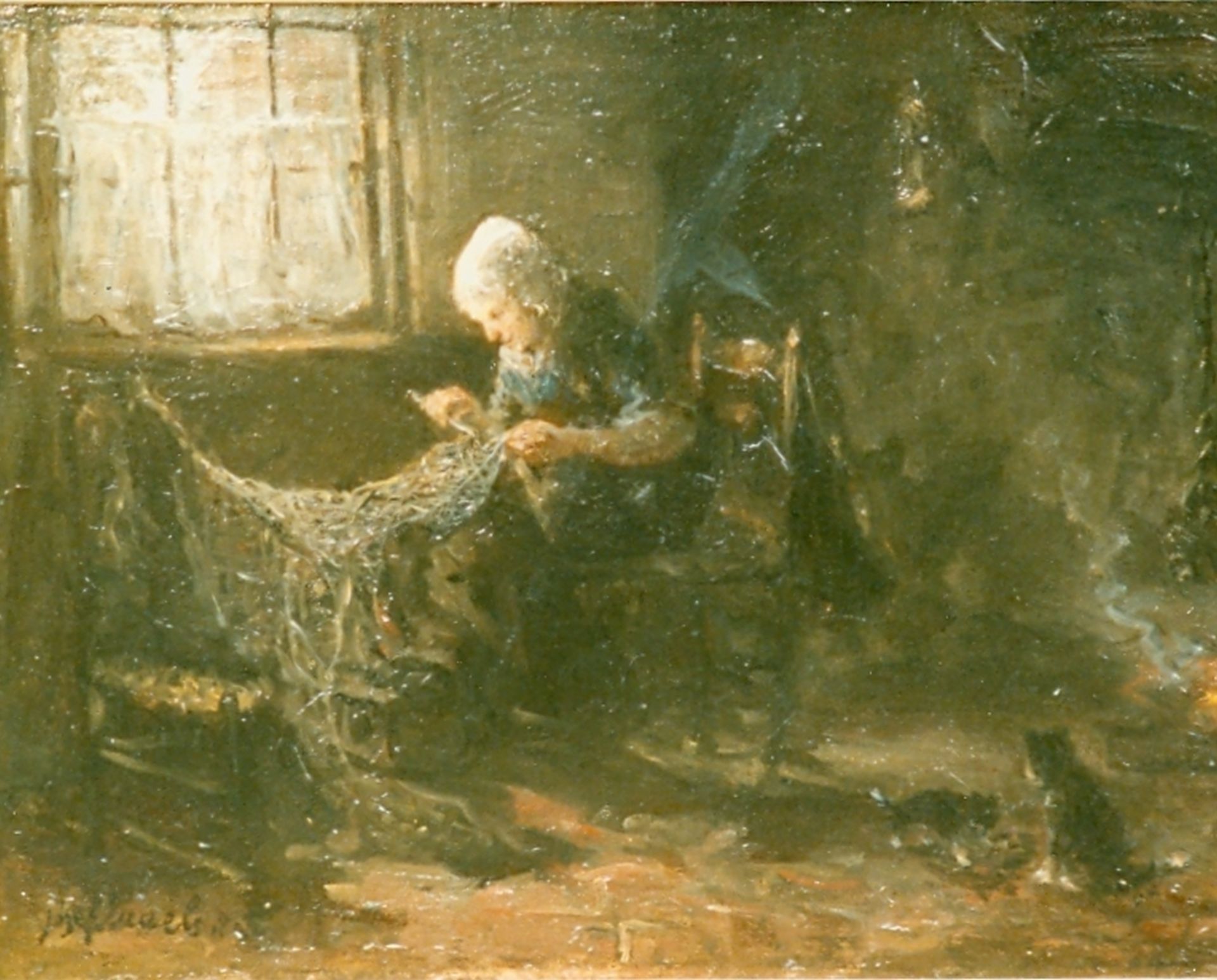 Jozef Israëls kunstwerk • schilderij • voorheen te koop Nettenboetster bij haardvuur