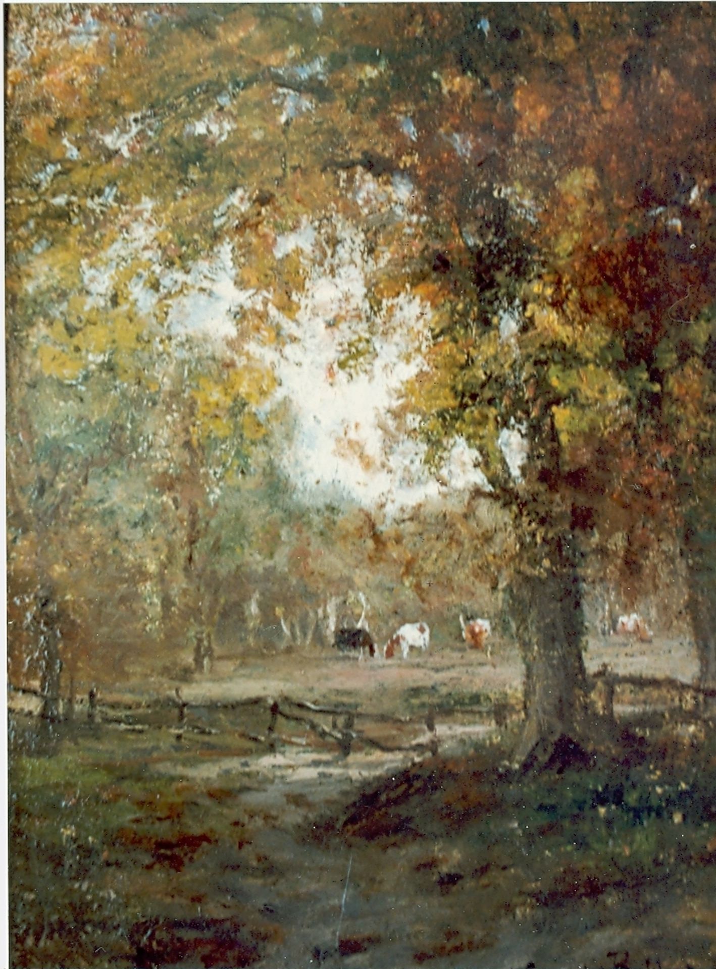 Julius Jacobus van de Sande Bakhuyzen kunstwerk • schilderij • voorheen te koop Grazende koeien op een open plek in het bos