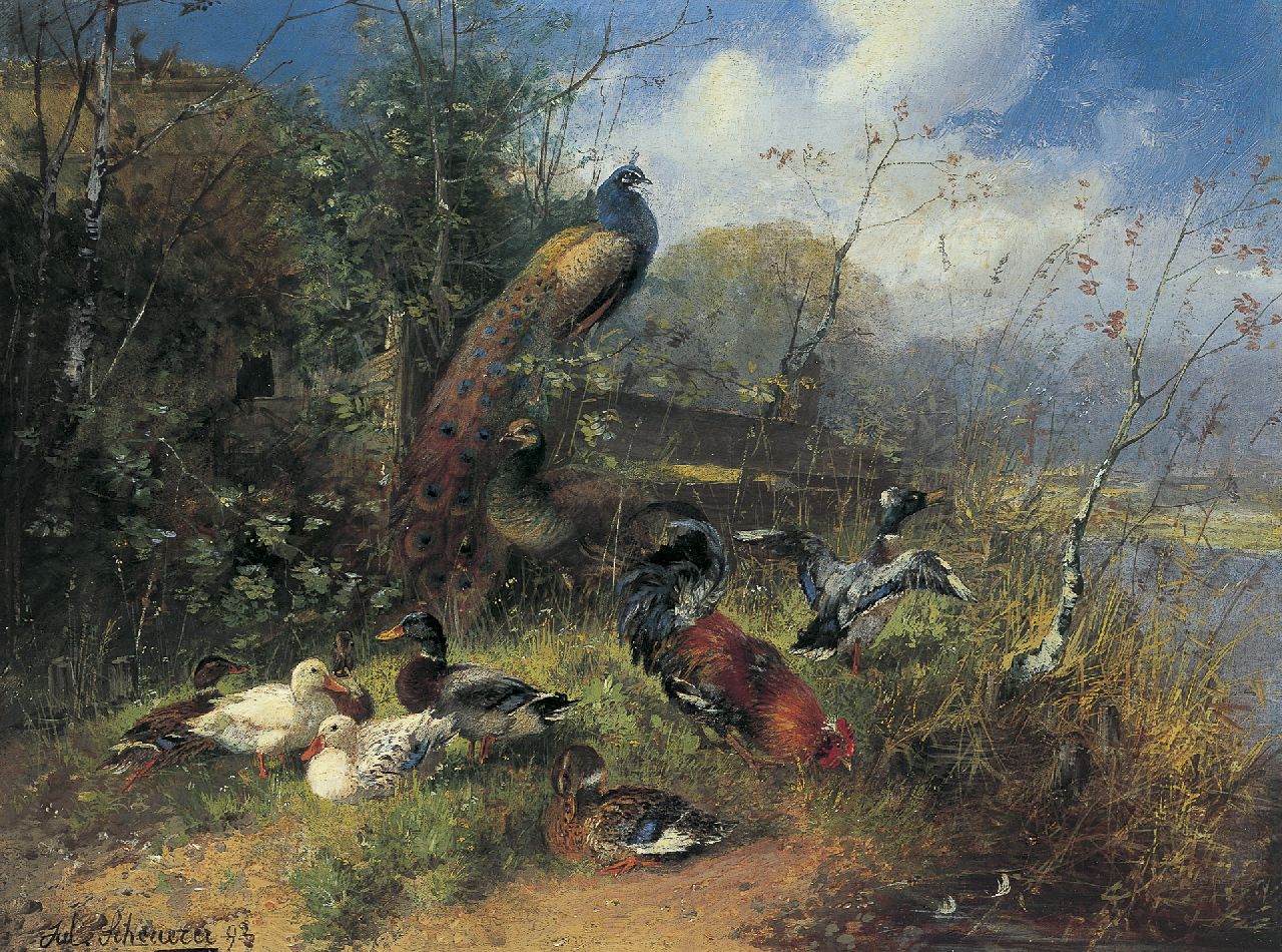 Hoewel hij korte tijd lessen volgde op de academie in München was de Zuid-Duitse kunstenaar Julius Scheuerer grotendeels autodidact. Hij schilderde landschappen en wild- en jachttaferelen, maar het meeste succes had hij met zijn pluimveetaferelen. Dit was vermoedelijk te danken aan het feit dat hij een nauwkeurige studie maakte van de anatomie en het gedrag van deze dieren. Scheuerer kwam uit een artistiek gezin. Zijn jongere broer Otto was eveneens schilder en ook gespecialiseerd in het uitbeelden van wild, kleinvee en vogels.