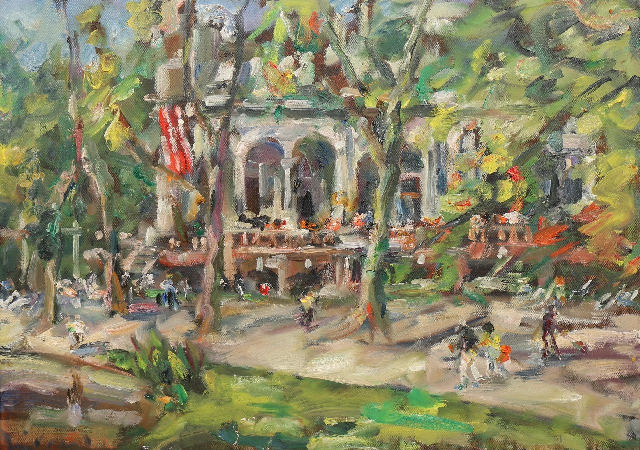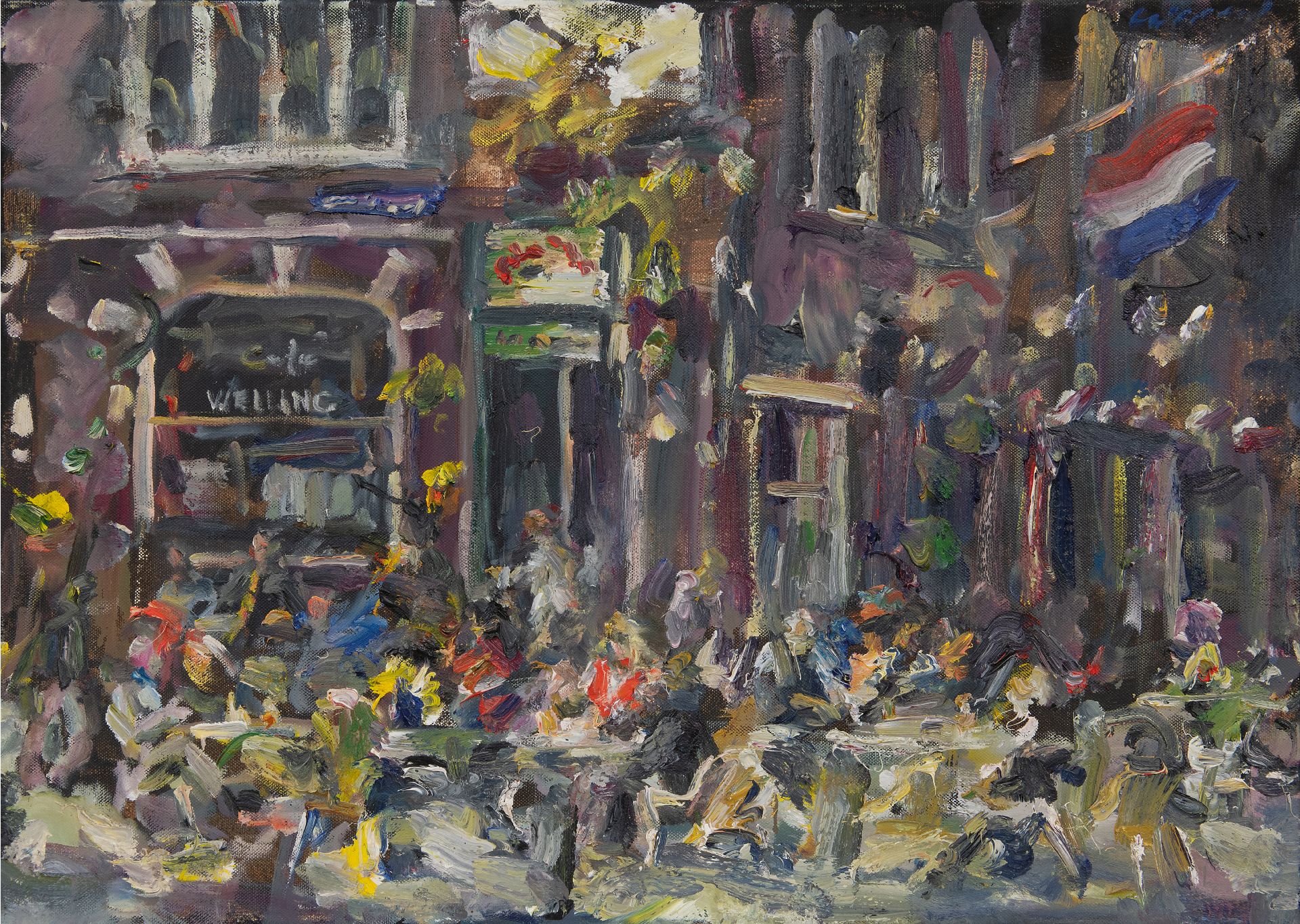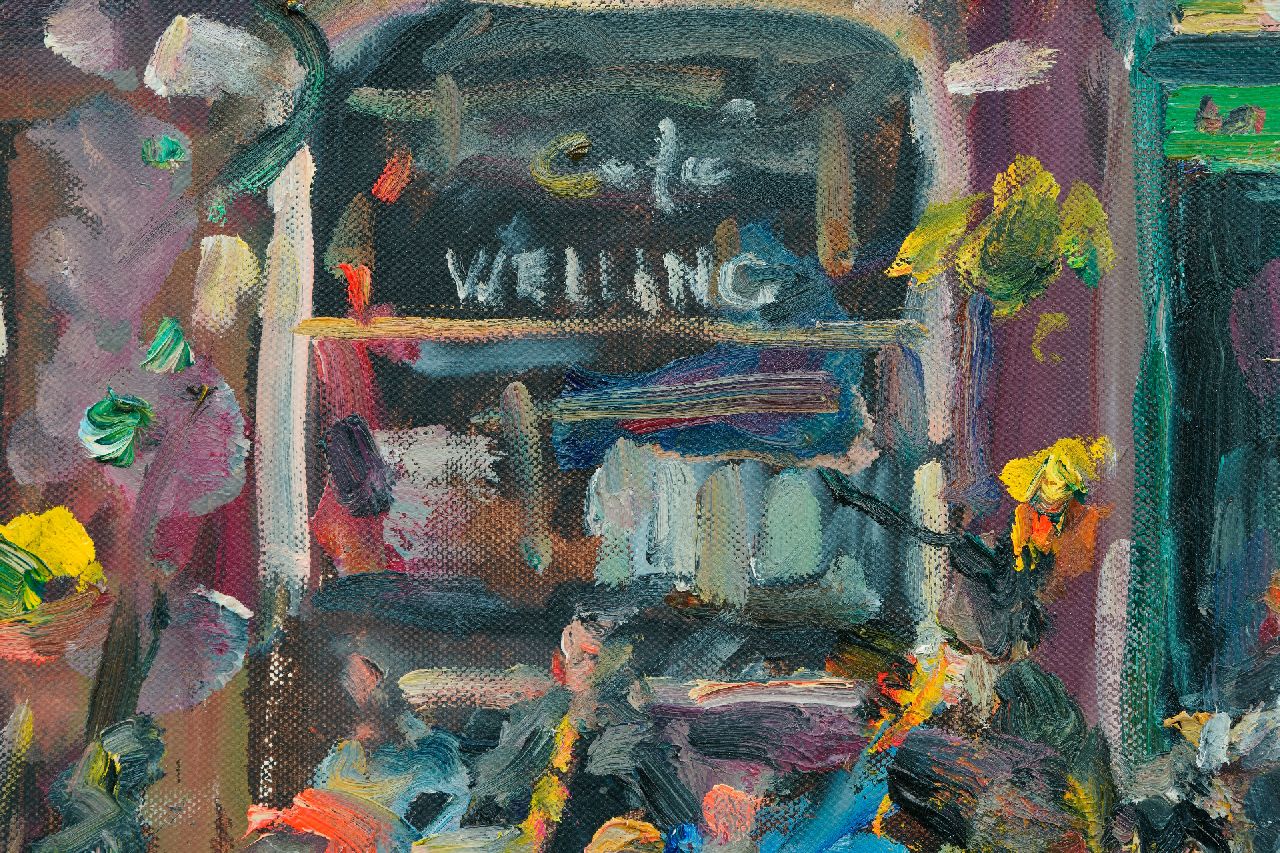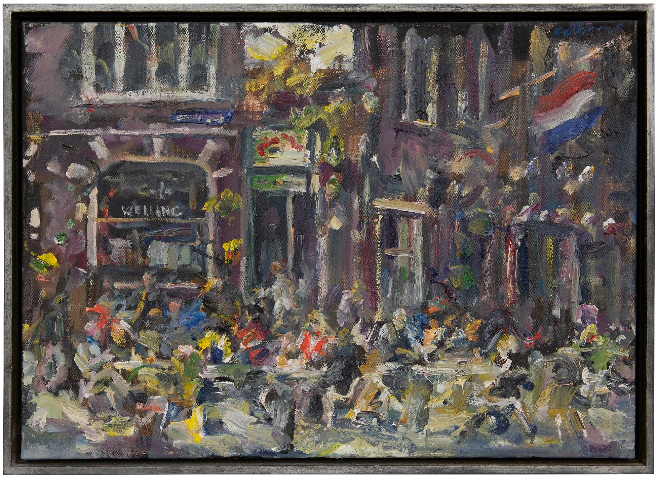Vanaf 1996 komt de in Duitsland geboren schilder Jürgen Leippert vrijwel ieder jaar in Amsterdam. Daar schildert hij impressies, direct naar de natuur, van het leven in de cafés en restaurants, het Vondelpark, de Pijp en de grachten. Ook schildert hij langs de kust bij Domburg en Noordwijk. In dit schilderij mengt hij zich als het ware tussen mensenmenigte rond café Welling achter het Concertgebouw in Amsterdam. De vlag hangt uit, dus misschien is het wel Koninginnedag. Leippert schildert de bezoekers snel, in korte, kleurige streken waarmee hij de geanimeerde drukte goed treft. Zijn stijl is impressionistisch en expressionistisch tegelijk, figuratief en soms ook haast abstract.