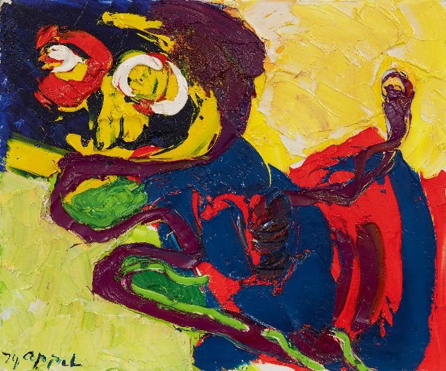 Karel Appel was één van de hoofdfiguren van de na-oorlogse Cobra-beweging (1948-1951). Zijn werk wordt gezien als representatief voor de idealen van deze groep schilders, die in hun schilderijen uitdrukking gaven aan hun verzet tegen de traditionele schilderkunst met haar regels en taboes. In zijn Cobra-tijd schilderde hij fabeldieren en fantasiewezens. Na 1951 werd zijn schildertrant steeds heftiger totdat lijn en kleurvlak samensmolten tot één turbulente verfmassa.