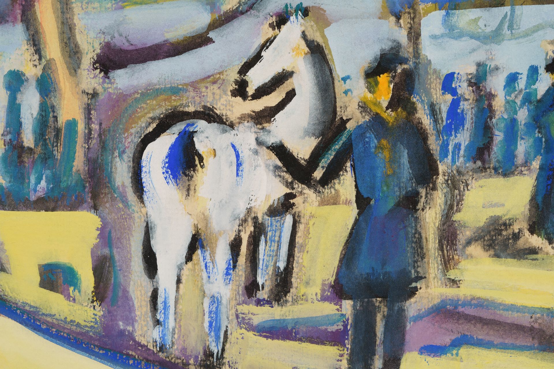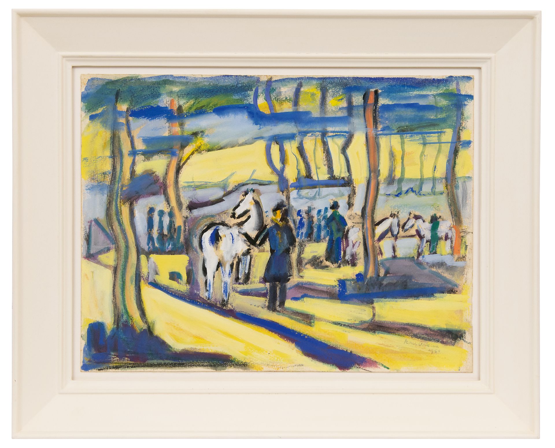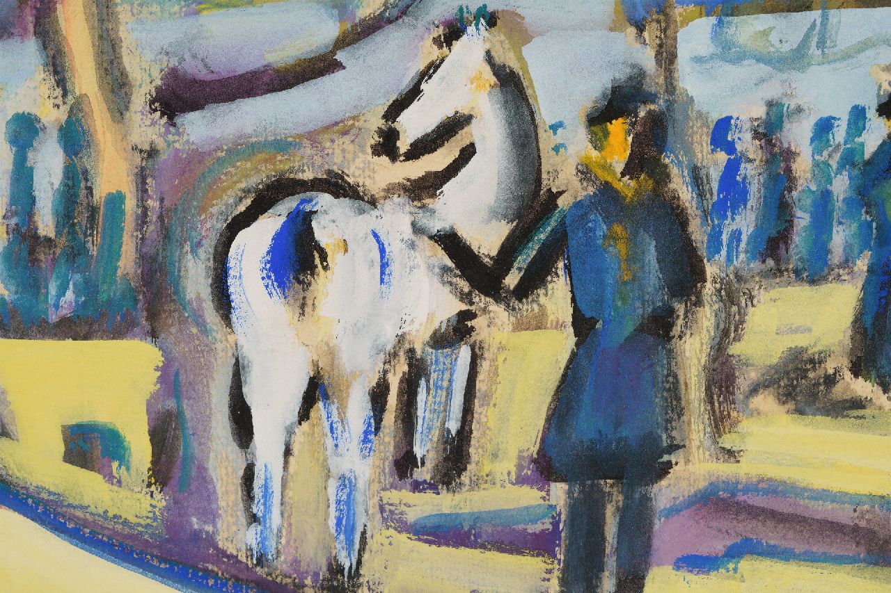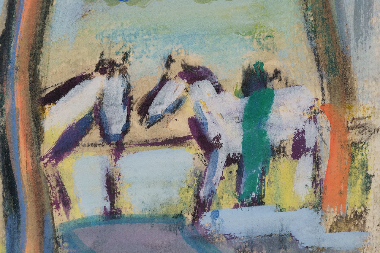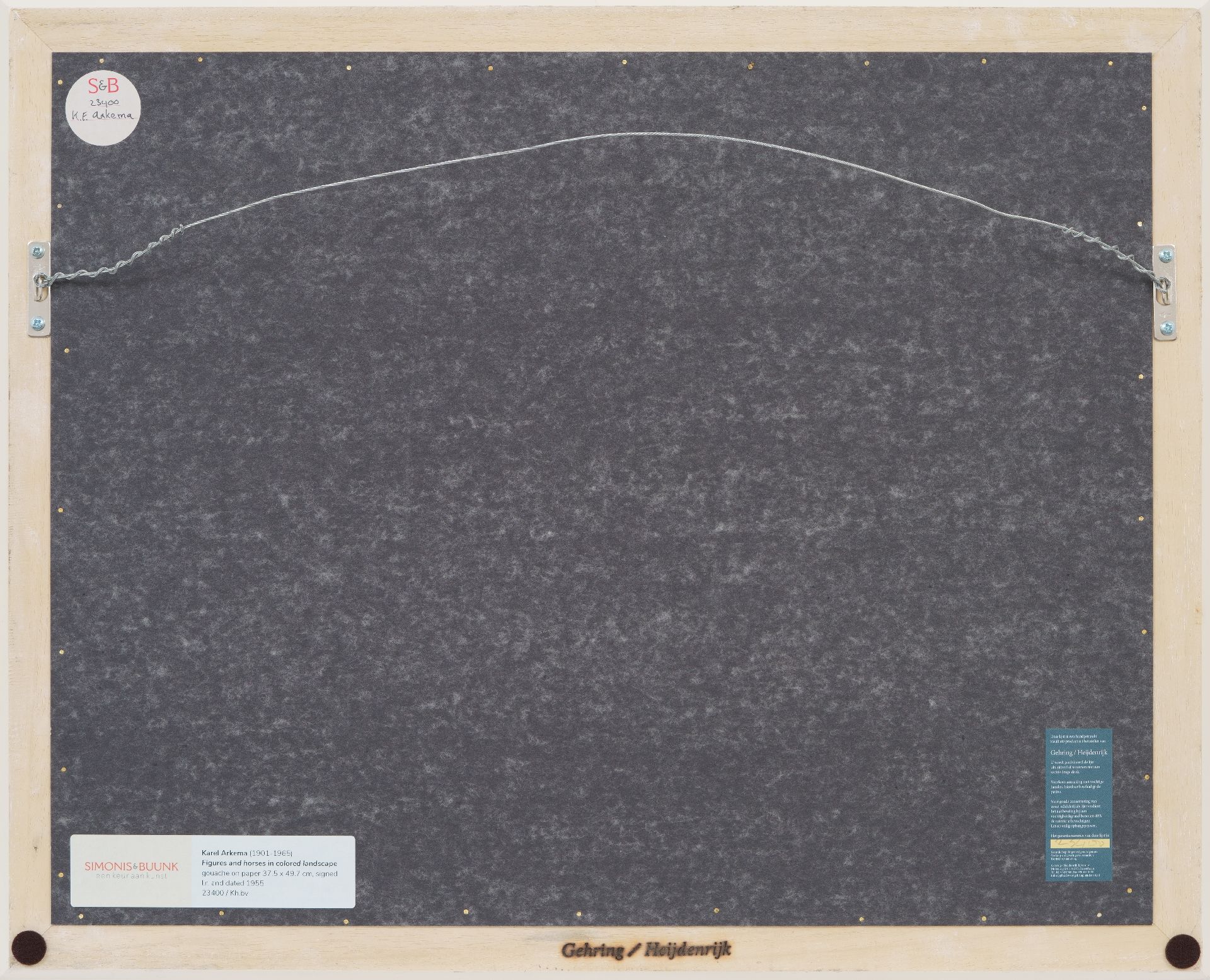 Karel Arkema kunstwerk • aquarel • tekening • te koop Figuren en paarden in gekleurd landschap