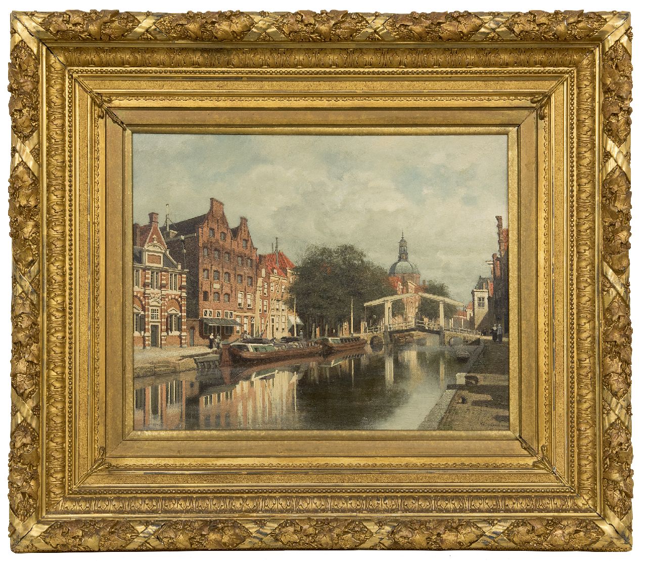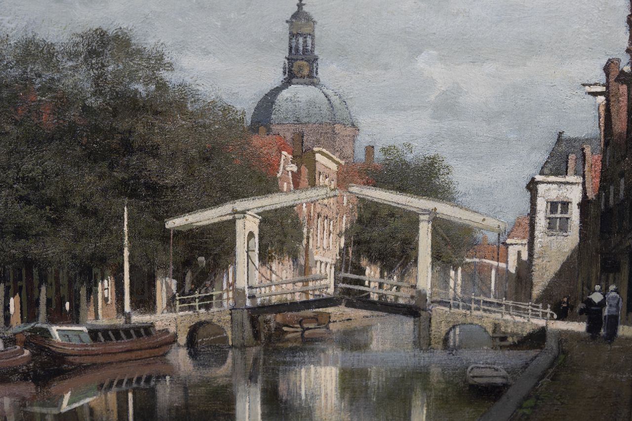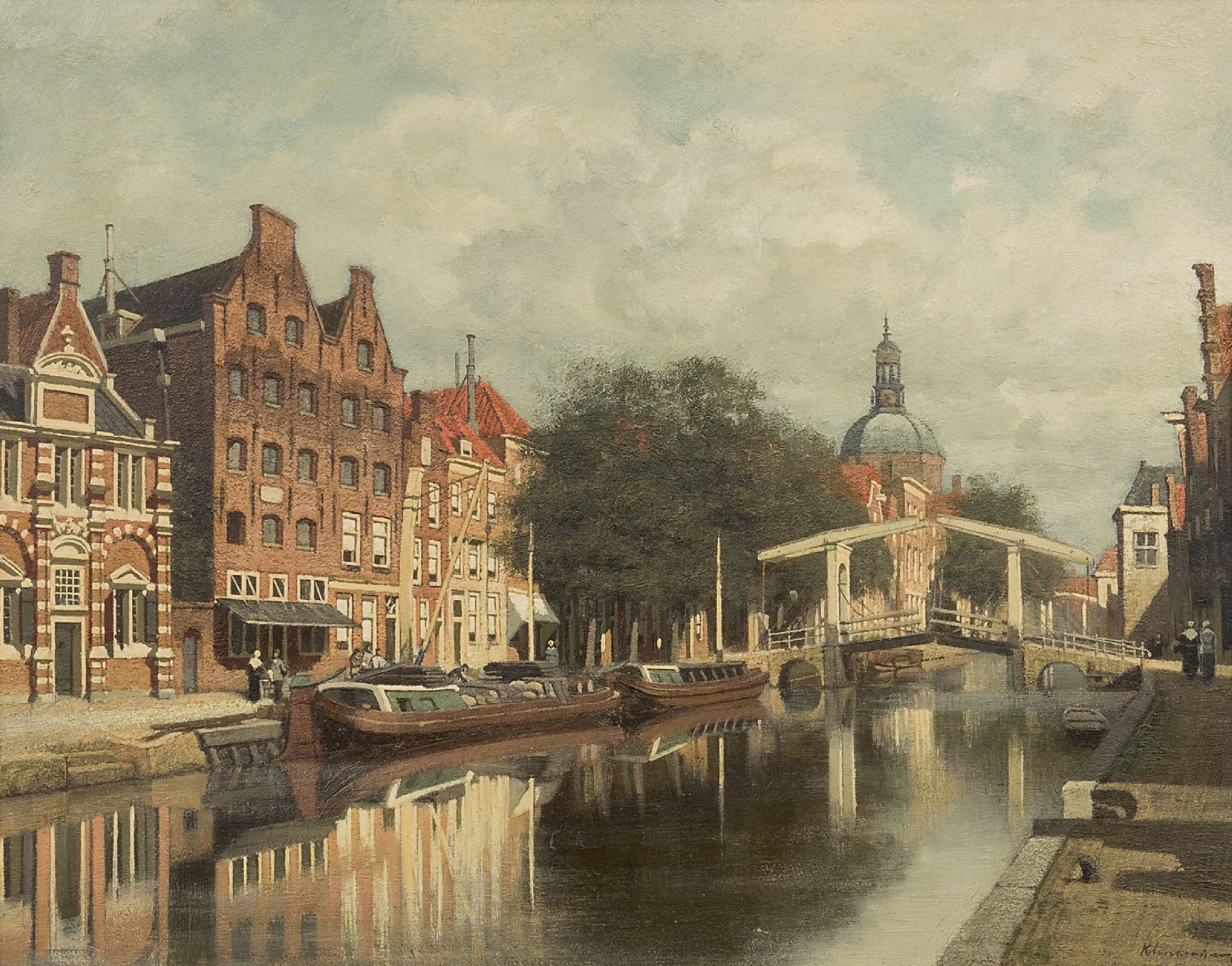 Karel Klinkenberg kunstwerk • schilderij • te koop De Oude Rijn te Leiden met de koepel van de Marekerk