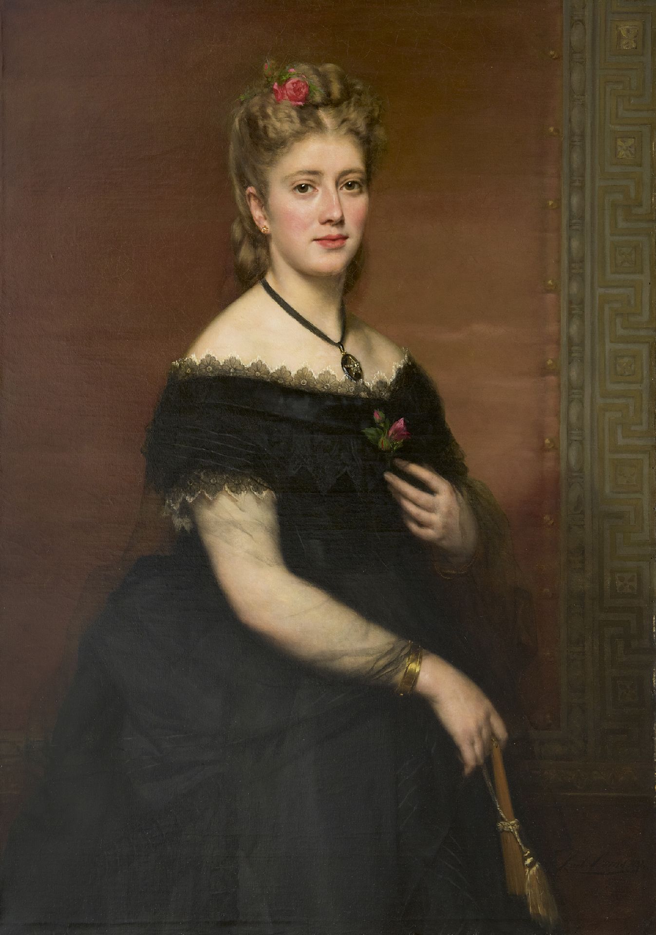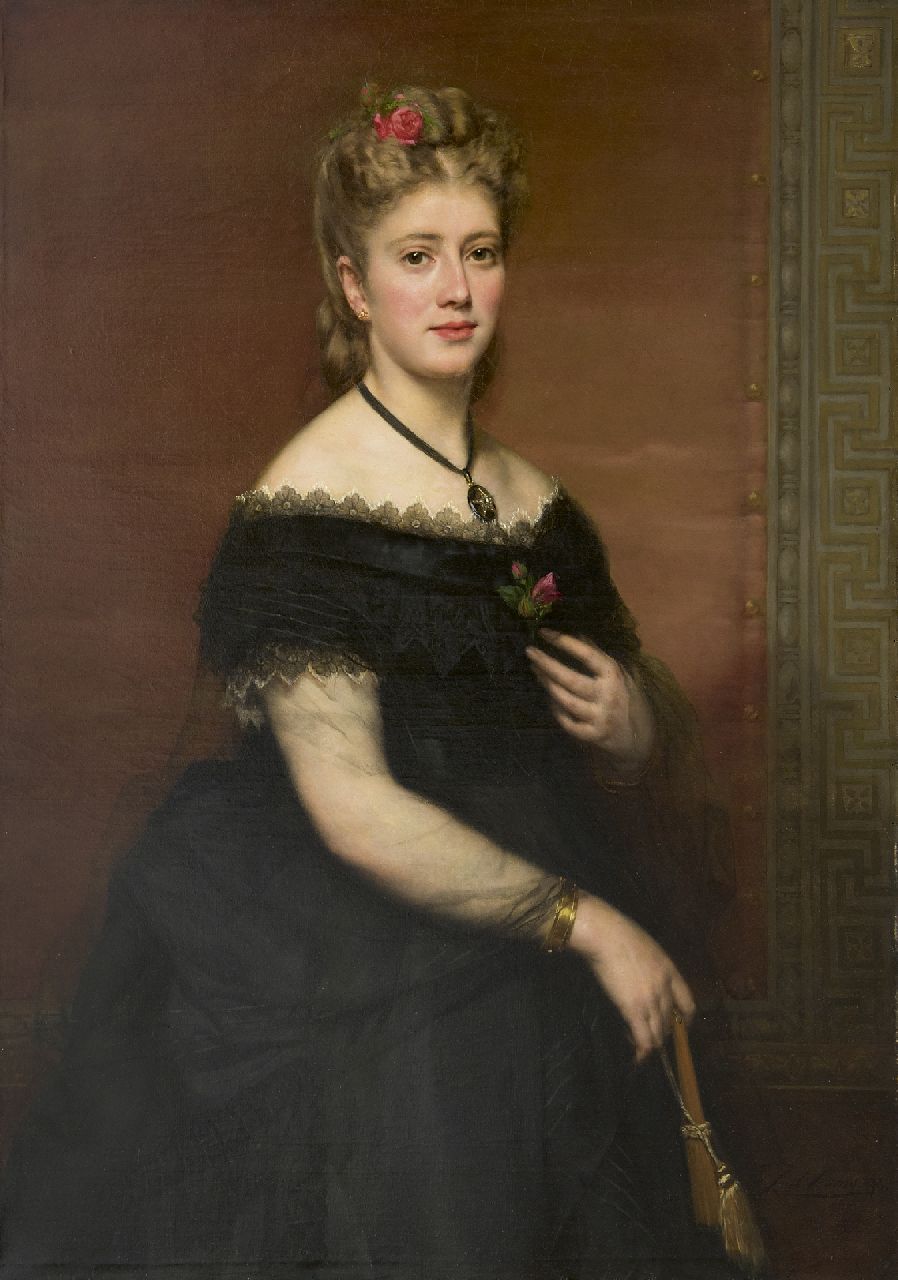 Karel Ooms kunstwerk • schilderij • voorheen te koop Portret van een vrouw in zwart zijden jurk