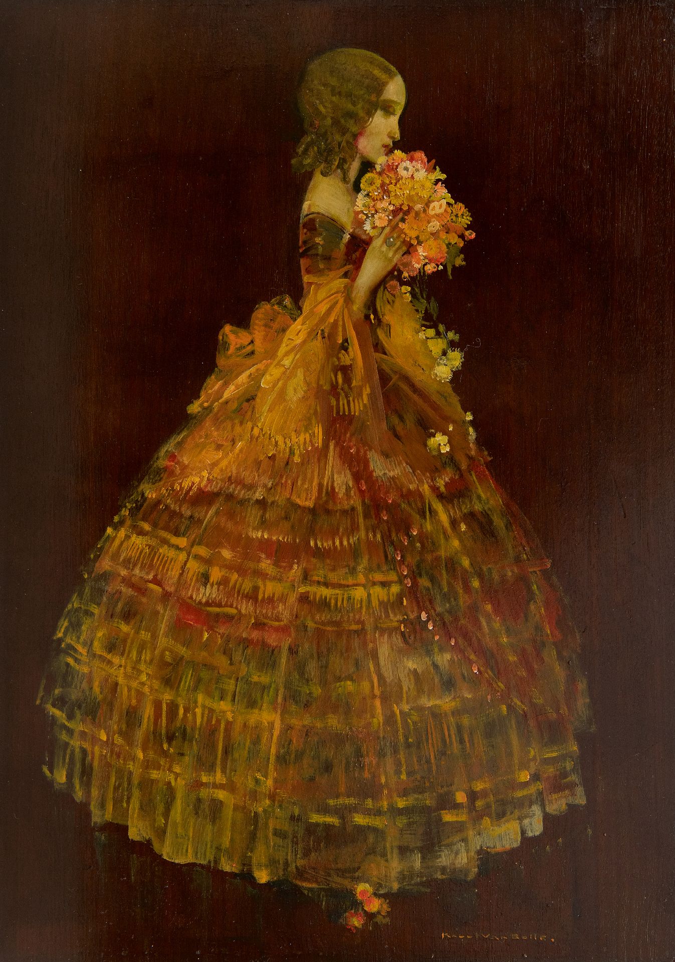 Karel van Belle kunstwerk • schilderij • voorheen te koop Vrouw in gele baljurk