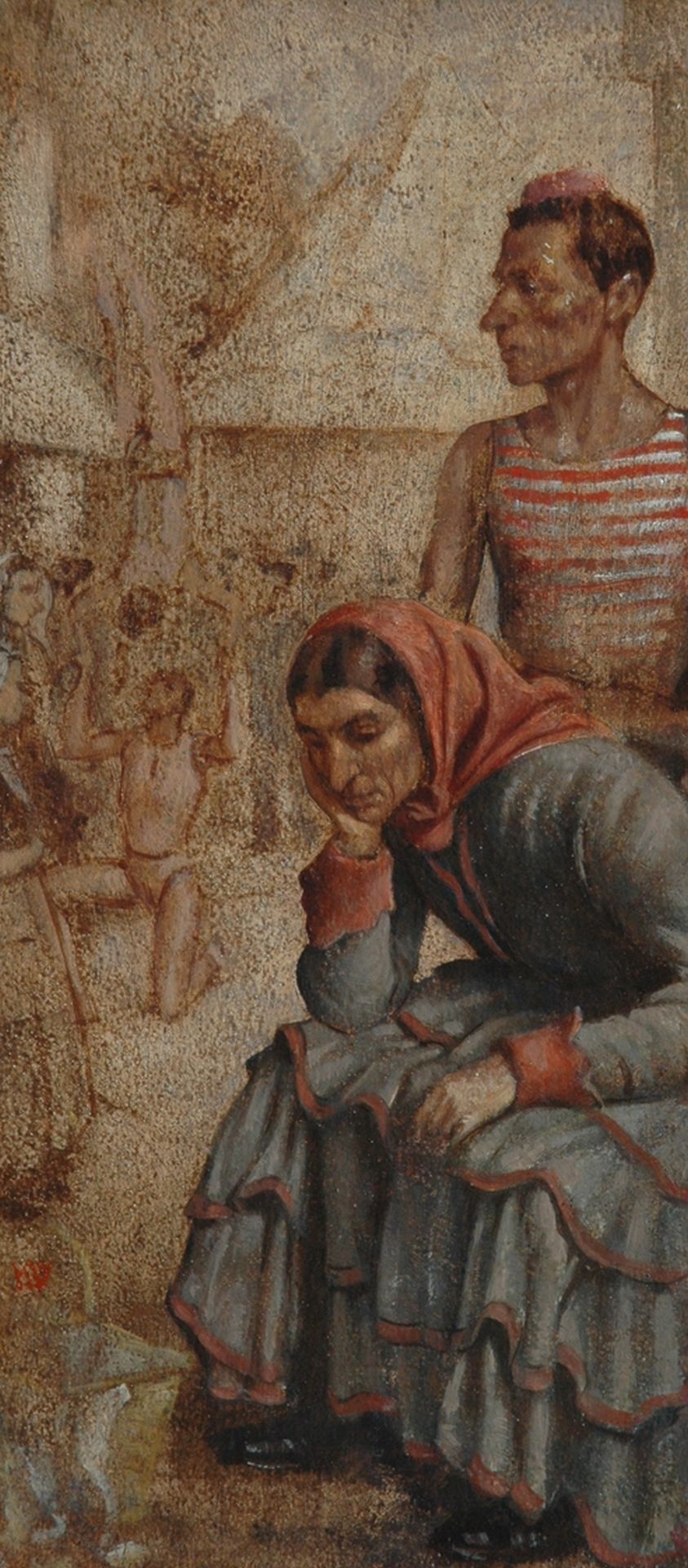 Karel van Veen was in ons land in de jaren ’50 en ’60 een gevierde hof- en societyschilder. Dit voorzag hem van een goed inkomen, waardoor er geen noodzaak was om zijn vrije werk te exposeren of verkopen. De schilder werd opgeleid aan de academie van Rotterdam (1917-1921), studeerde daarna nog enige tijd in Parijs, woonde in Veere en vestigde zich uiteindelijk weer in Rotterdam. In de schilderijen die hij daarna maakte putte hij uit zijn reiservaringen, zoals taferelen van Italiaanse schonen op een Hollandse kade. Van Veen loste dit op door het geheel het aanzien te geven van een circus- of kermisvoorstelling. Ook maakte hij beelden en ledenpoppen, die weer figureren in zijn schilderijen.