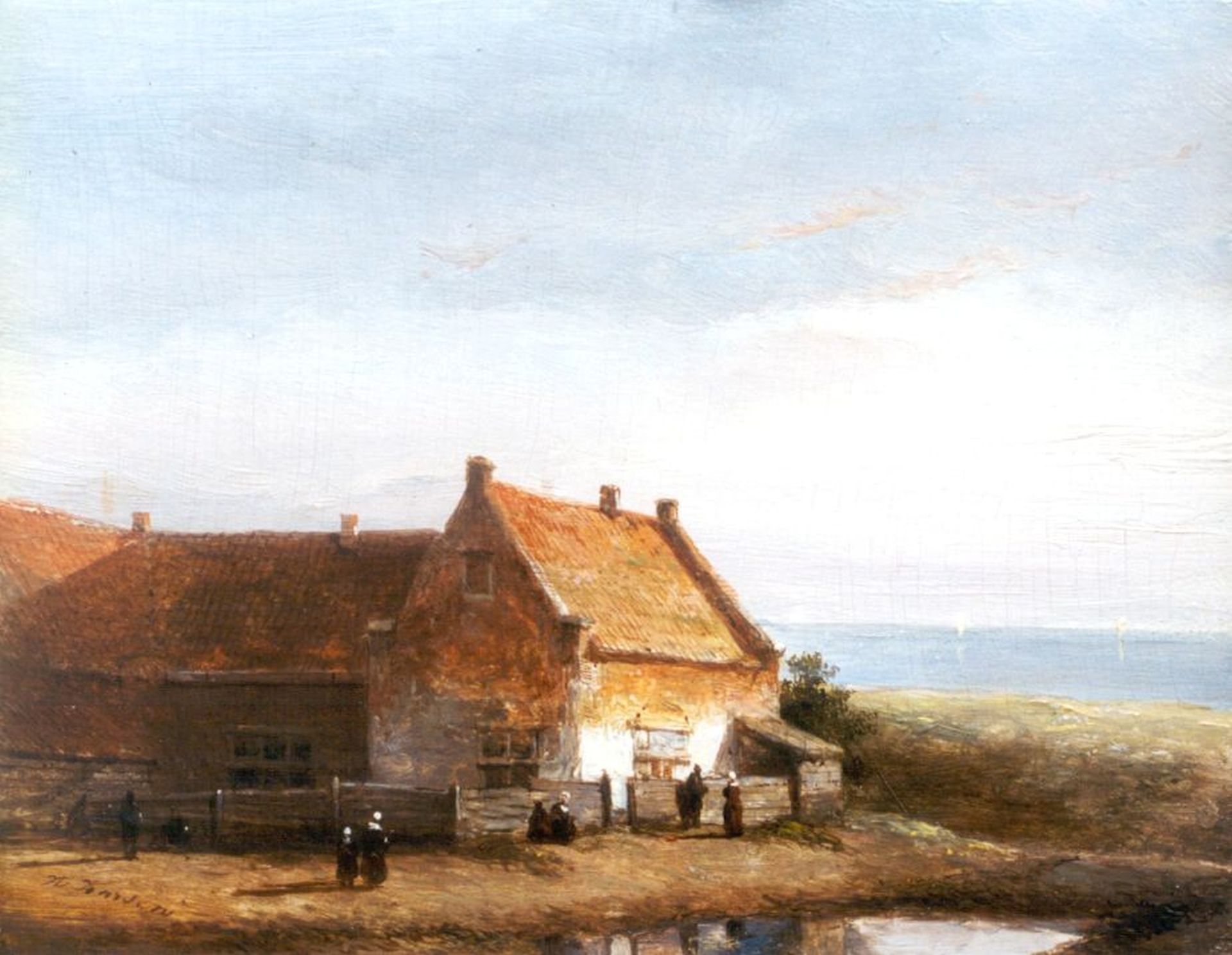 Karsen K.  | Kasparus Karsen, Huis in de duinen met vissersvrouwen, olieverf op paneel 14,9 x 19,0 cm, gesigneerd linksonder