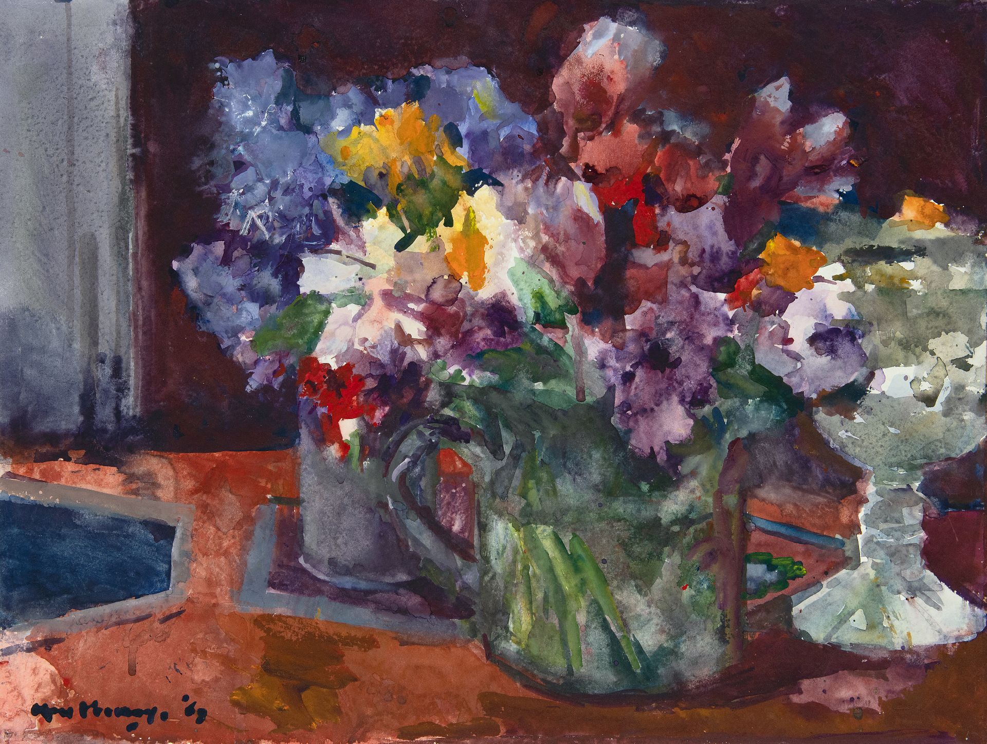 Kees Verwey kunstwerk • aquarel • tekening • te koop Vazen met bloemen; verso: zomerbloemen