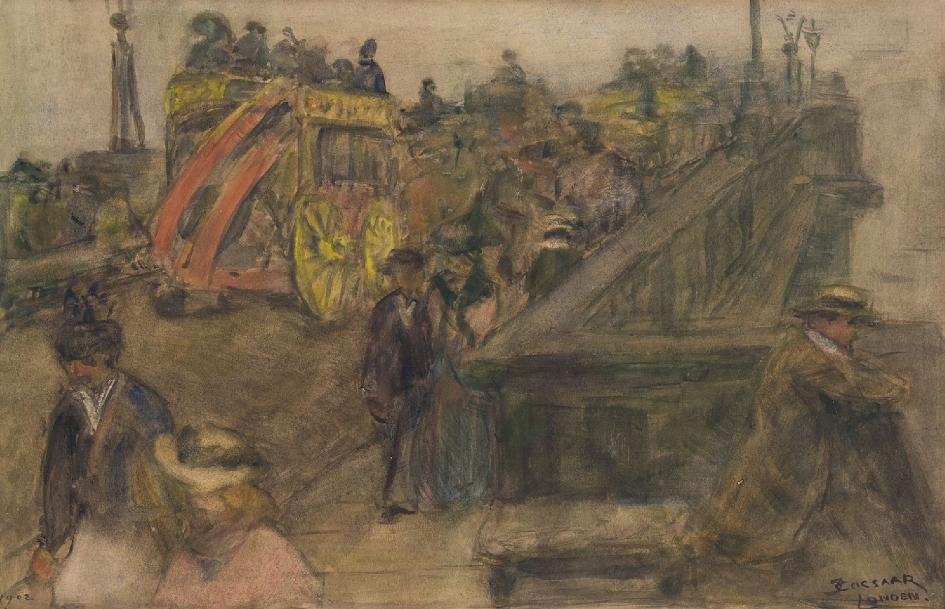 Ko Cossaar kunstwerk • aquarel • tekening • te koop Paardentram op Westminster Bridge, Londen